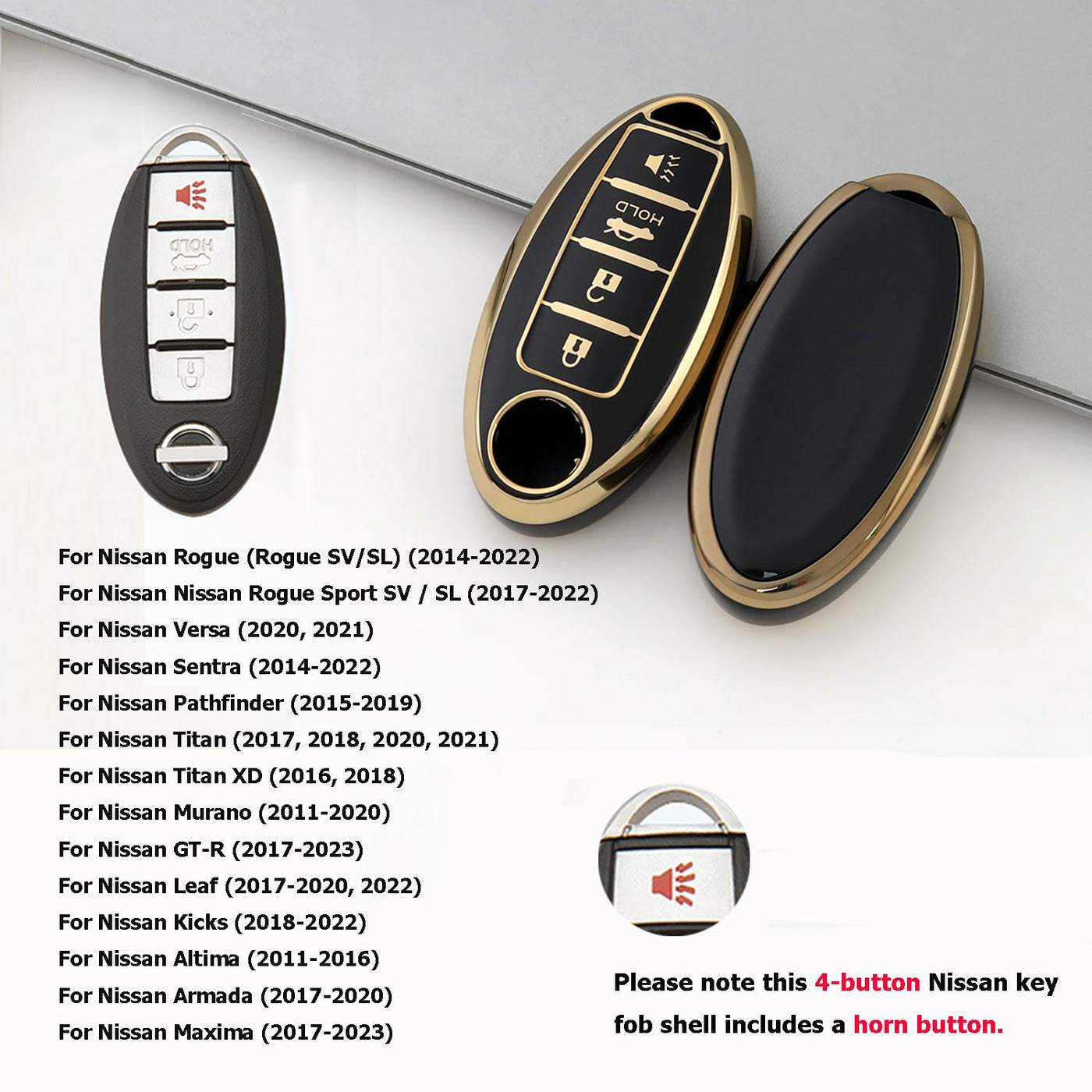 Full Protection Key Case Cover For Nissan Altima Maxima Rogue Armada Sentra Pathfinder 4 button. For Nissan Rogue (Rogue SV/SL) (2014-2022) For Nissan Nissan Rogue Sport SV / SL (2017-2022) For Nissan Versa (2020, 2021) For Nissan Sentra (2014-2022) For Nissan Pathfinder (2015-2019) For Nissan Titan (2017, 2018, 2020, 2021) For Nissan Titan XD (2016, 2018) For Nissan Murano (2011-2020) For Nissan GT-R (2017-2023) For Nissan Leaf (2017-2020, 2022) For Nissan Kicks (2018-2022) For Nissan Altima (2011-2016) For Nissan Armada (2017-2020) For Nissan Maxima (2017-2023) Note: Even if the type of the car is the same, the car key fob might be different based on the different year of manufacturing, so please DOUBLE CHECK your key shape before purchasing.