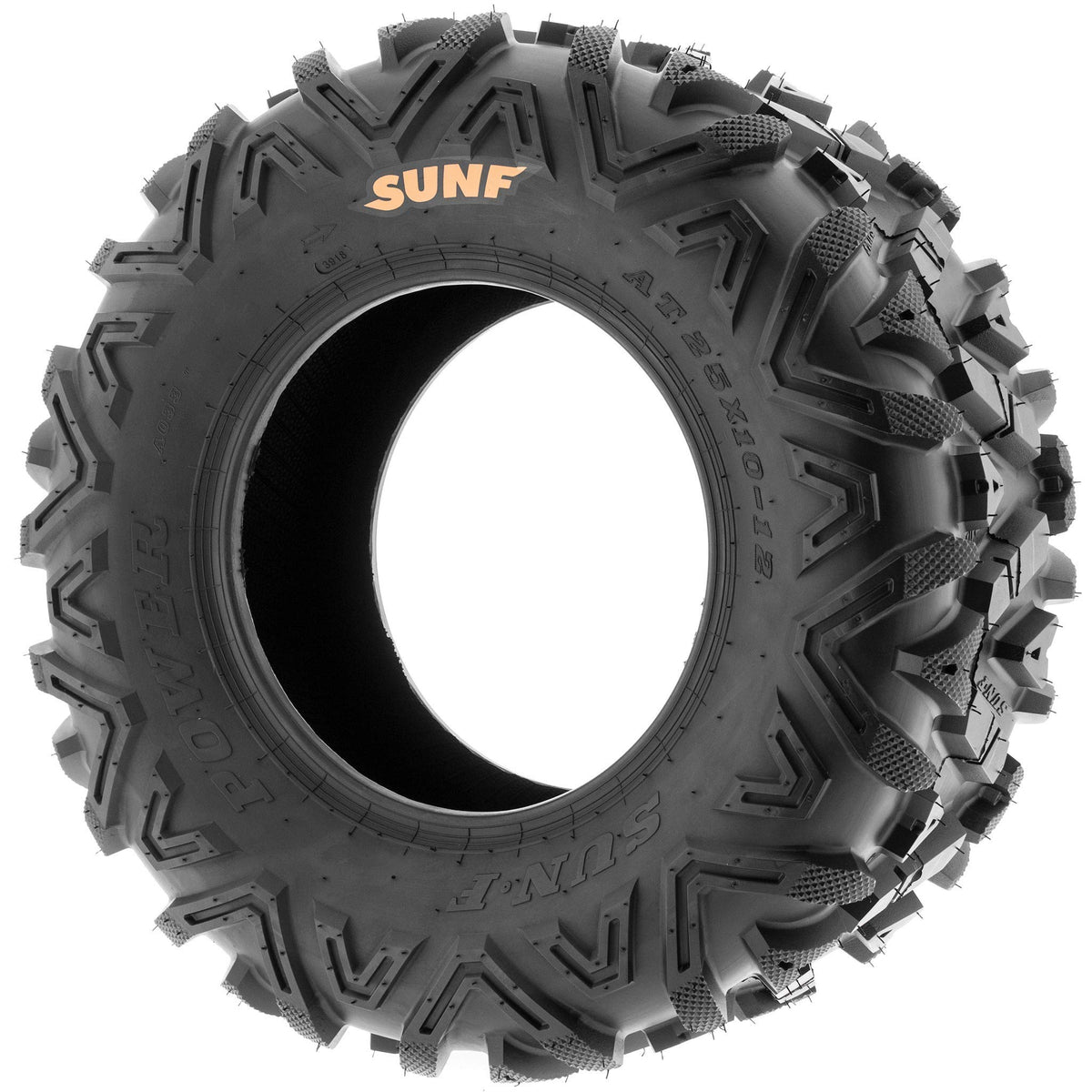 Model Description:The SunF A033 is among the worlds most popular footprints. Its aggressive, non directional tread pattern maintains even braking and a smooth ride while providing maximum traction. For more details, see full description. If you have any questions or concerns, please contact us.Tire Specifications:Total Number of Tires: 1Tire Size: 25x10-12Tire QTY: 1Rim Size: 12 x 8.0Ply Rating: 6Tire Diameter: 25Tread Depth: 21Max Load: 737 (335kg)Max PSI: 14Tire Weight: 26