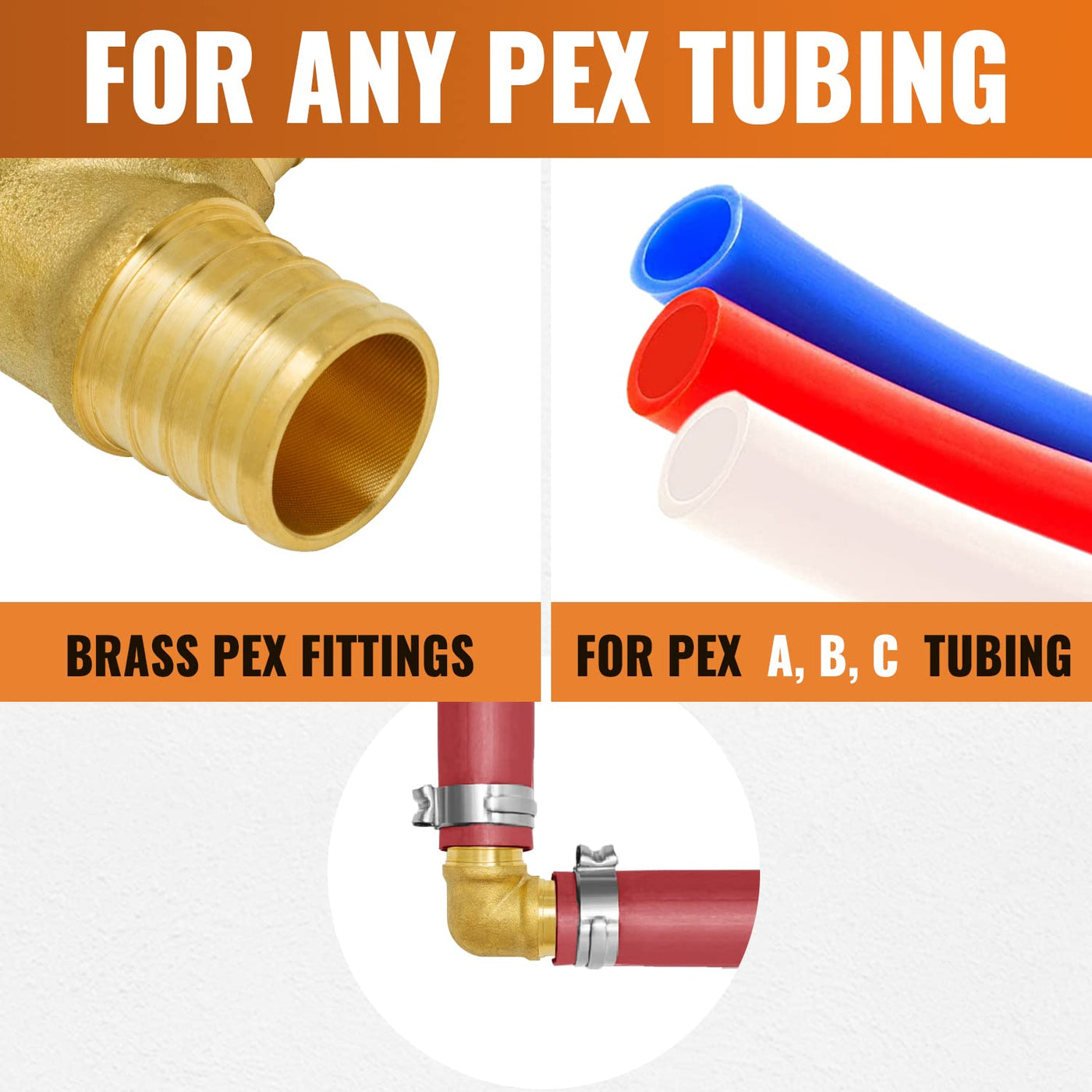 Q: Are these fittings compatible with all types of PEX tubing?A: Yes, these brass crimp fittings are compatible with PEX types A, B, and C. They can be used with stainless steel clamp rings or copper crimp rings for secure connections.