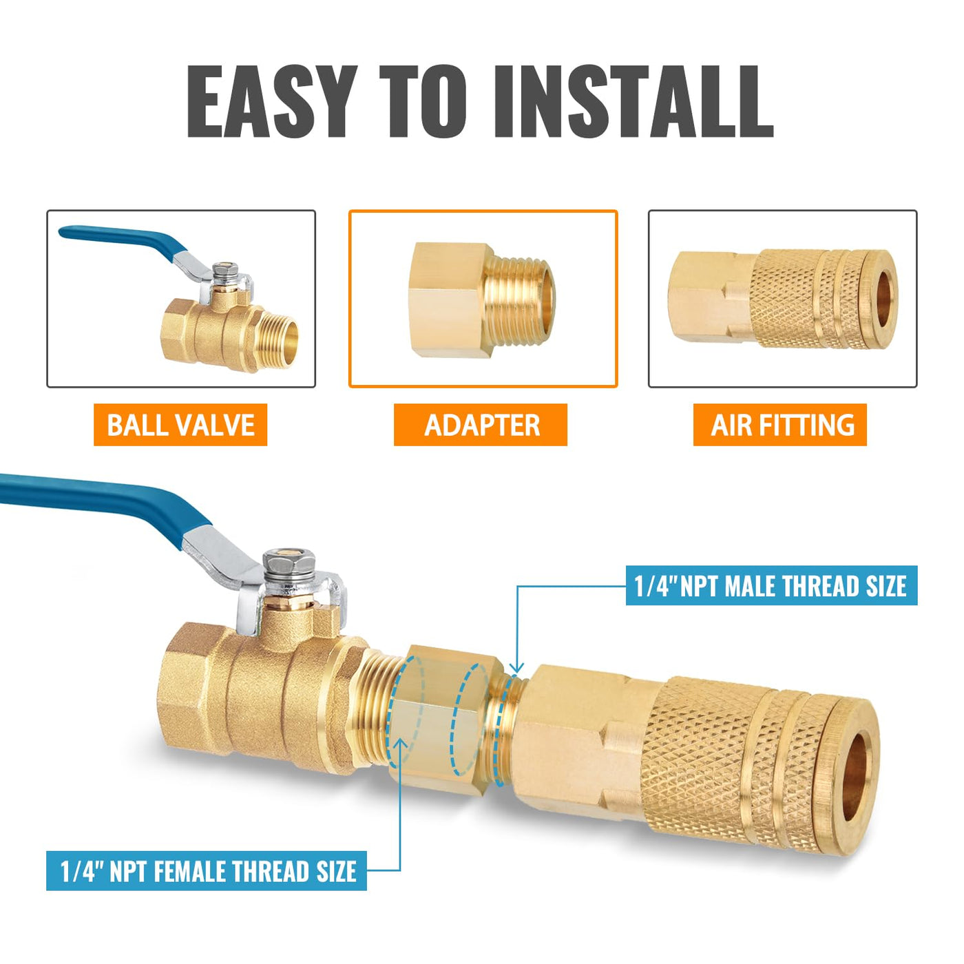 Q: What are the specifications of the SUNGATOR Brass Pipe Fittings?A: The SUNGATOR Brass Pipe Fittings feature 1/4" NPT male pipe x 1/4" NPT female pipe connections. They are made from high-grade solid brass, known for its durability and resistance to corrosion. These fittings can withstand temperatures up to 100 °C (212 °F) and meet the ASTM B584 and ASME/ANSI B16 specifications for quality assurance.