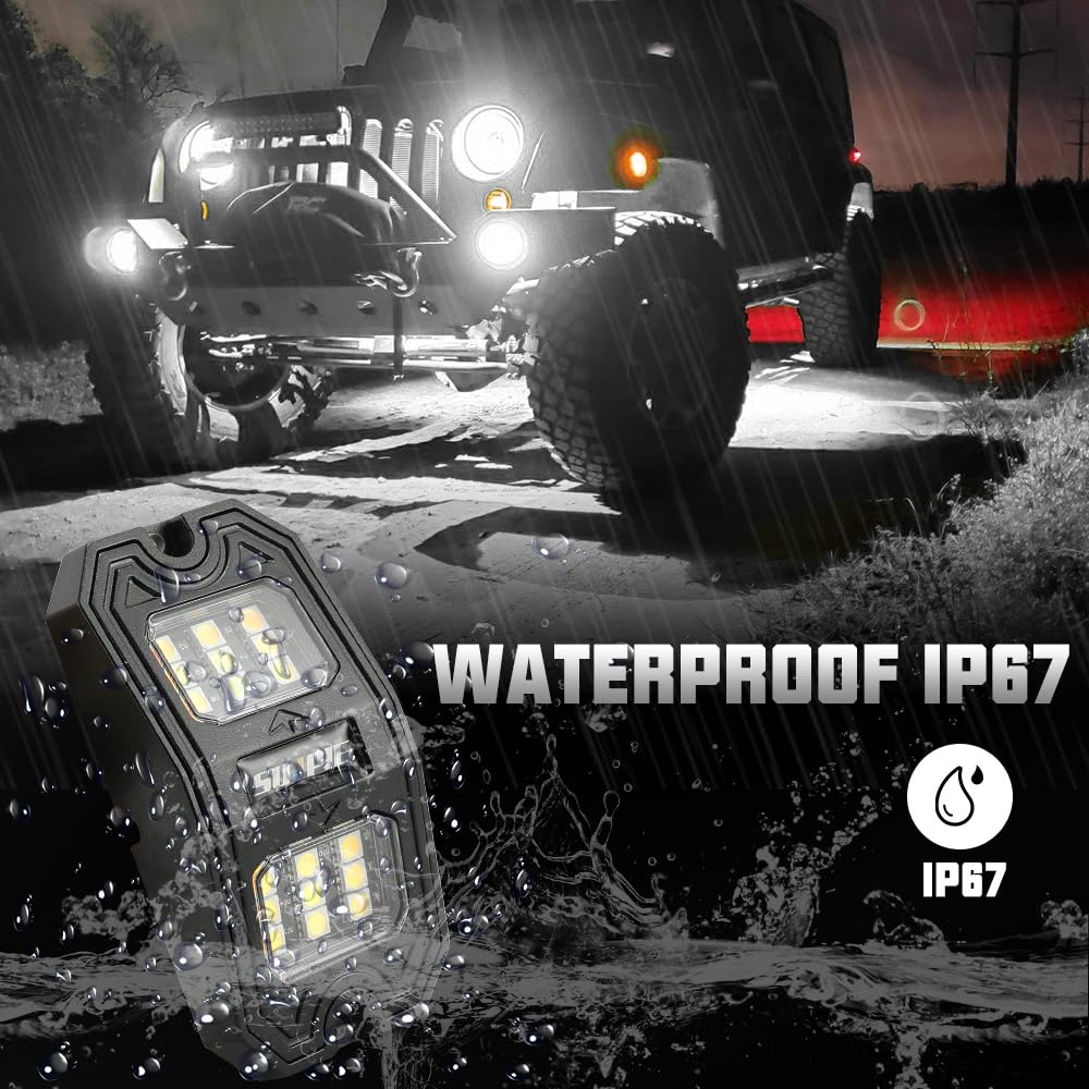 Q: How waterproof and dustproof are these lights?A: The SUNPIE rock lights are rated IP67, meaning they are fully waterproof and dustproof. They have been tested to function even when covered with water, providing reliable performance in various weather conditions without worrying about moisture entering the light's interior.