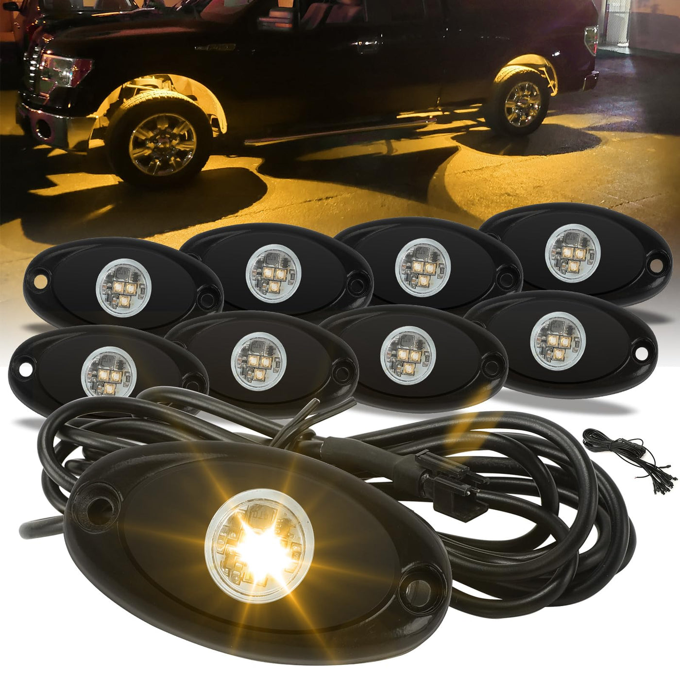 SUNPIE 8 Pods Amber Aluminium Metal LED Rock Lights with Extension Wires for Off Road Truck Car ATV SUV UTV Motorcycle Under Body Glow Light Lamp Fender Lighting, 32-4/5Ft Extension Wires Provided