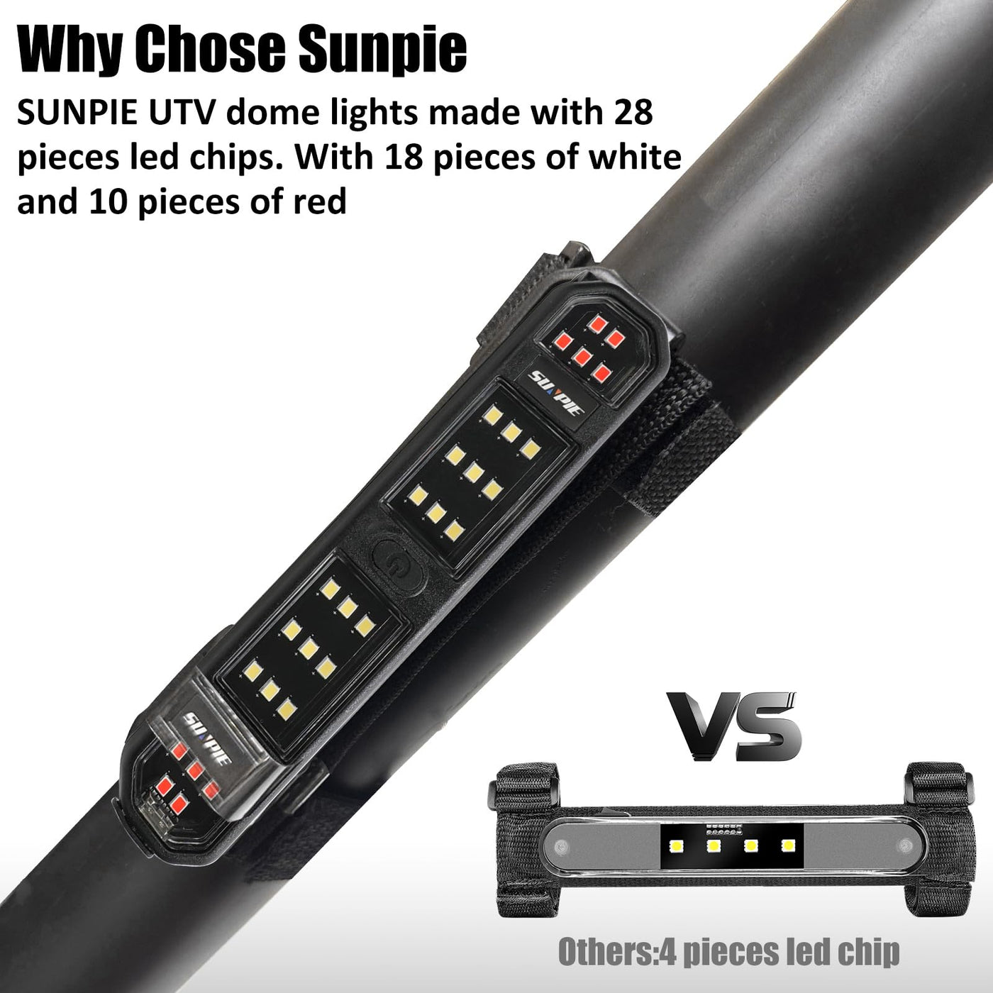Description Enhance your UTV experience with sunpie versatile UTV Dome Light featuring both white and red LEDs. Designed to provide optimal illumination in any situation, this dome light offers bright white light for maximum visibility and a red light option to preserve night vision. Its compact, waterproof design ensures durability and reliability, making it the perfect addition for off-road adventures. Do not Wiring and Easy Install: Compare with other roll bar dome light, these utv dome light no wiring or drilling required. Package come with straps, easily attache the dome lights to any dimension of the roll bar. Durable: SUNPIE UTV dome lights Built to withstand rugged off-road conditions, our UTV dome lights are constructed from high-quality materials for long-lasting performance. Versatile Use: Whether you're working on your UTV or enjoying a night ride, sunpie utv dome lights offer the perfect lighting solution for any situation.