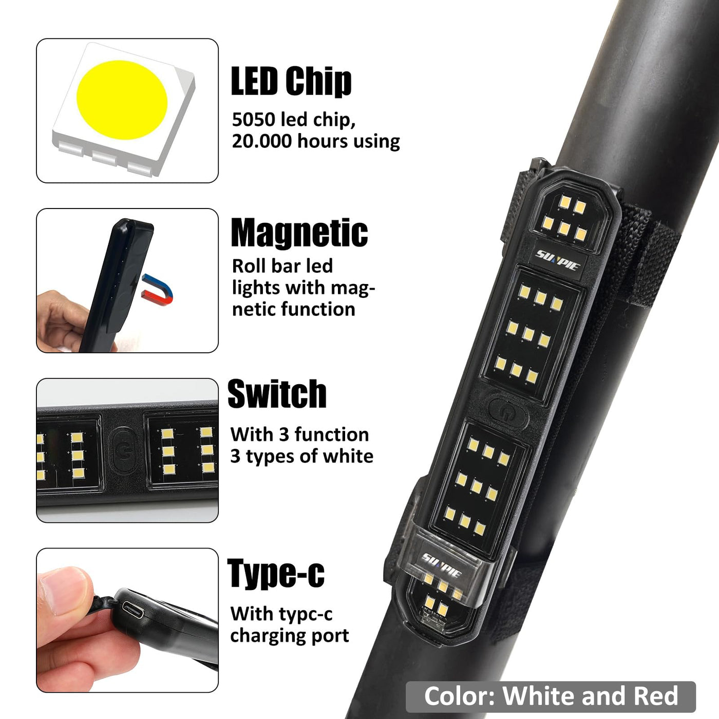 Description Illuminate your UTV adventures with SUNPIE utv accessories cutting-edge UTV Dome Light. Engineered for ultimate versatility, this dome light features 56 high-performance SMD LEDs strategically placed to ensure optimal lighting. With three distinct brightness settings, from strong white light to low light, you can customize your illumination to suit any situation. The built-in clip and magnet provide multiple mounting options, making installation a breeze no matter where your journey takes you. Durable: SUNPIE can am defender accessories UTV dome lights Built to withstand rugged off-road conditions, our UTV dome lights are constructed from high-quality materials for long-lasting performance. Versatile Use: Whether you're working on your UTV or enjoying a night ride, sunpie utv dome lights offer the perfect lighting solution for any situation. Universal Compatibility: SUNPIE honda talon accessories roll bar led lights feature a universal roll bar mount, ensuring compatibility with most UTV models. The roll bar led lights design with magnet as well, which can attach to any metal surface. Whats more, the utv led lights with clip design, easily to clip any place. polaris ranger accessories Dome light for utv with bright led chip, fit for roll bar, play a role of interior lights for utv polaris rzr and so on. As a utv accessories lights or emergency lights for outside.