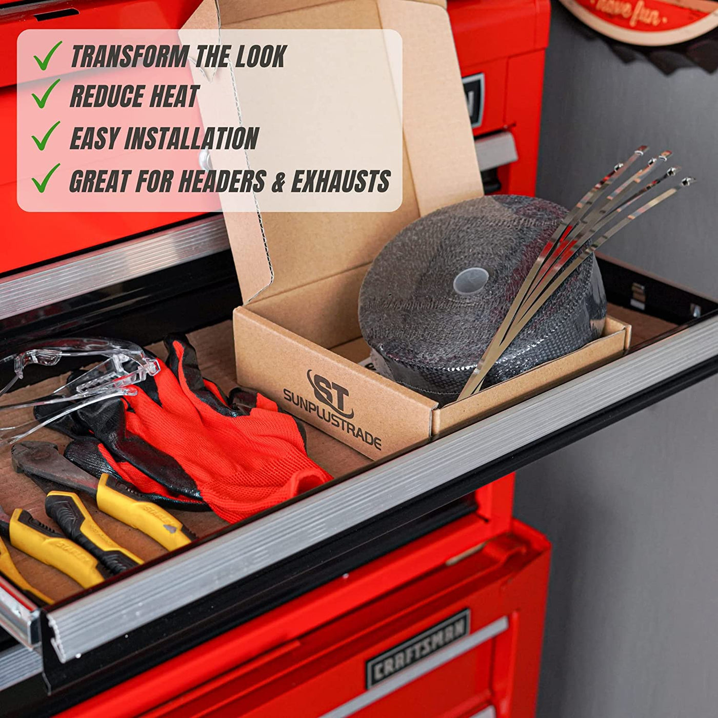 Sunplustrade 2' X 50' Black Exhaust Header Heat Wrap For Motorcycle Cars Heat Shield With Stainless Steel Zip Tie (2 Pack)