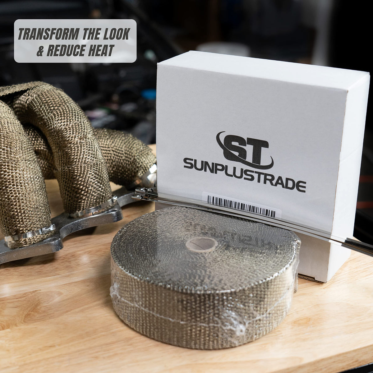 Q: How does the exhaust wrap help in reducing heat under the hood?A: The thermal properties of the volcanic rock fiber used in the SunplusTrade Exhaust Wrap can reduce heat under the hood by up to 50%, improving engine performance and protecting sensitive components.