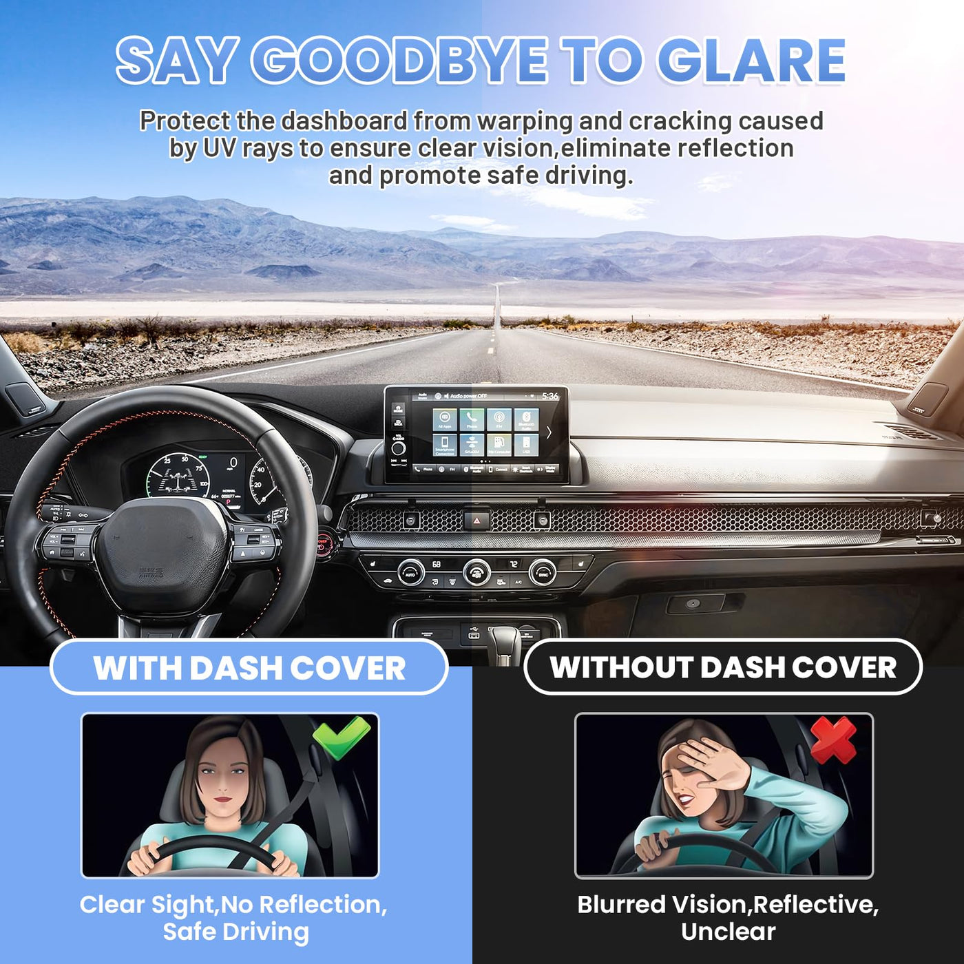 Q: Does the Sunsdrew Dash Cover help reduce glare while driving?A: Absolutely! The Sunsdrew Dash Cover is designed to minimize glare and reflections on your windshield, enhancing visibility for a safer and more comfortable driving experience.