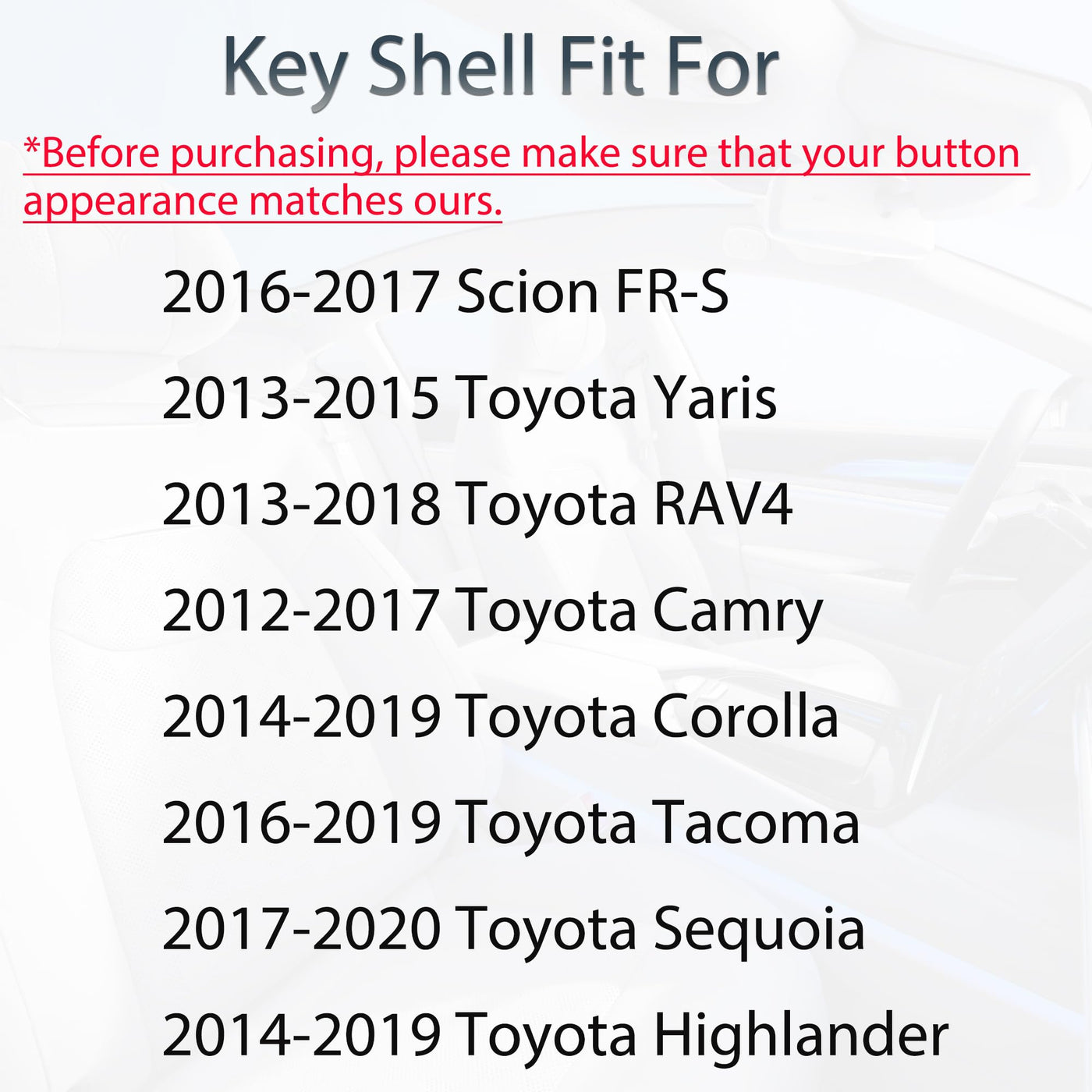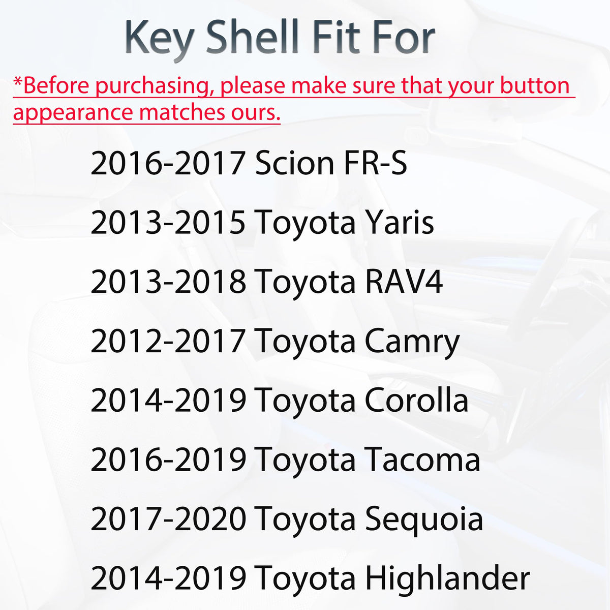 2012-2017 Toyota Camry 2014-2019 Toyota Corolla 2014-2019 Toyota Highlander 2013-2015 Toyota Yaris 2016-2017 Scion FR-S 2013-2018 Toyota RAV4 2017-2020 Toyota Sequoia 2016-2019 Toyota Tacoma