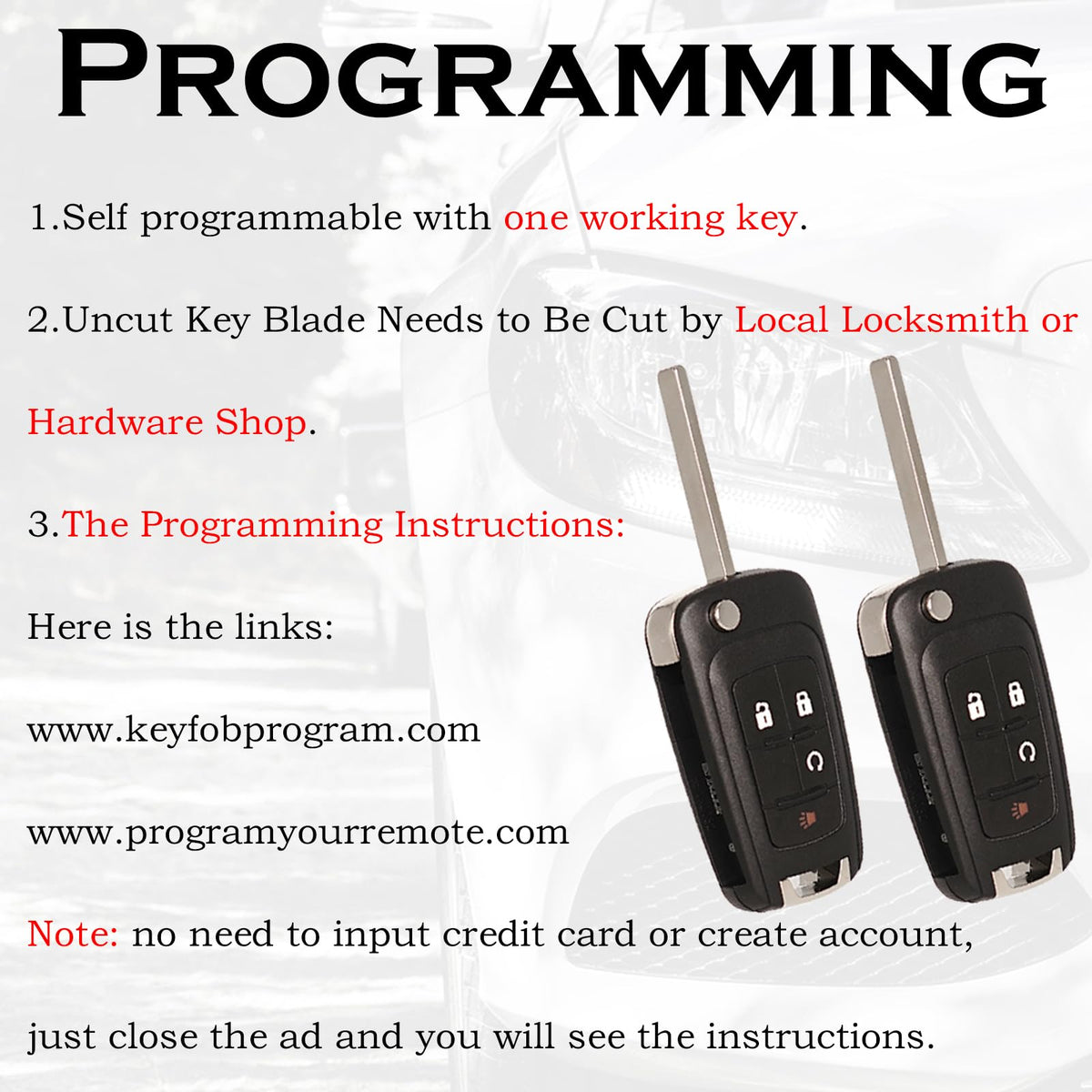 Important Note: It only Supports Regular Key Vehicles, It Doesnt Supports Push Start Button Vehicles. WILL NOT WORK FOR VEHICLES WITH PASSIVE ENTRY (also called PEPS, push button ignition, smart key or proximity system) Compatible with GMC Models: Terrain 2010 2011 2012 2013 2014 2015 2016 2017 2018 2019 2020 2021 Compatible with Buick Models: Encore 2014 2015 2016 2017 2018 Compatible with Chevrolet/Chevy Models: Equinox 2010 2011 2012 2013 2014 2015 2016 2017 2018 2019 Impala 2016 2017 2018 2019 Sonic 2012 2013 2014 2015 2016 2017 Replacement for: FCC ID: OHT01060512/V2T01060512/V2T01060514/AVL-B01T1AC/AVL-B01T2AC Part Numbers: 20873622, 20835400, 20873620 PROGRAMMING: Self programmable with one working key. Self-Programming Instructions Link Will Be Provided with Every Order. Uncut Key Blade Needs to Be Cut by Local Locksmith or Hardware Shop. Frequency: 315 Mhz Battery Type: Coin / Button Cell Chip: 46 (New version) Battery: CR2032