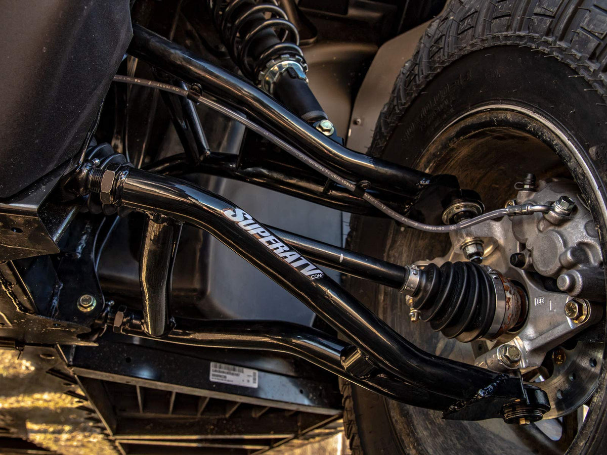 Q: What are the benefits of using SuperATV Arched 2" Forward Offset A Arms?A: The SuperATV Arched 2" Forward Offset A Arms offer enhanced tire clearance, allowing you to run up to 32" tires without a lift kit. This forward offset improves stability over uneven terrain, making it easier to navigate hills and obstacles. The heavy-duty 1.25" tubing is designed to be stronger than OEM parts, ensuring durability and performance.