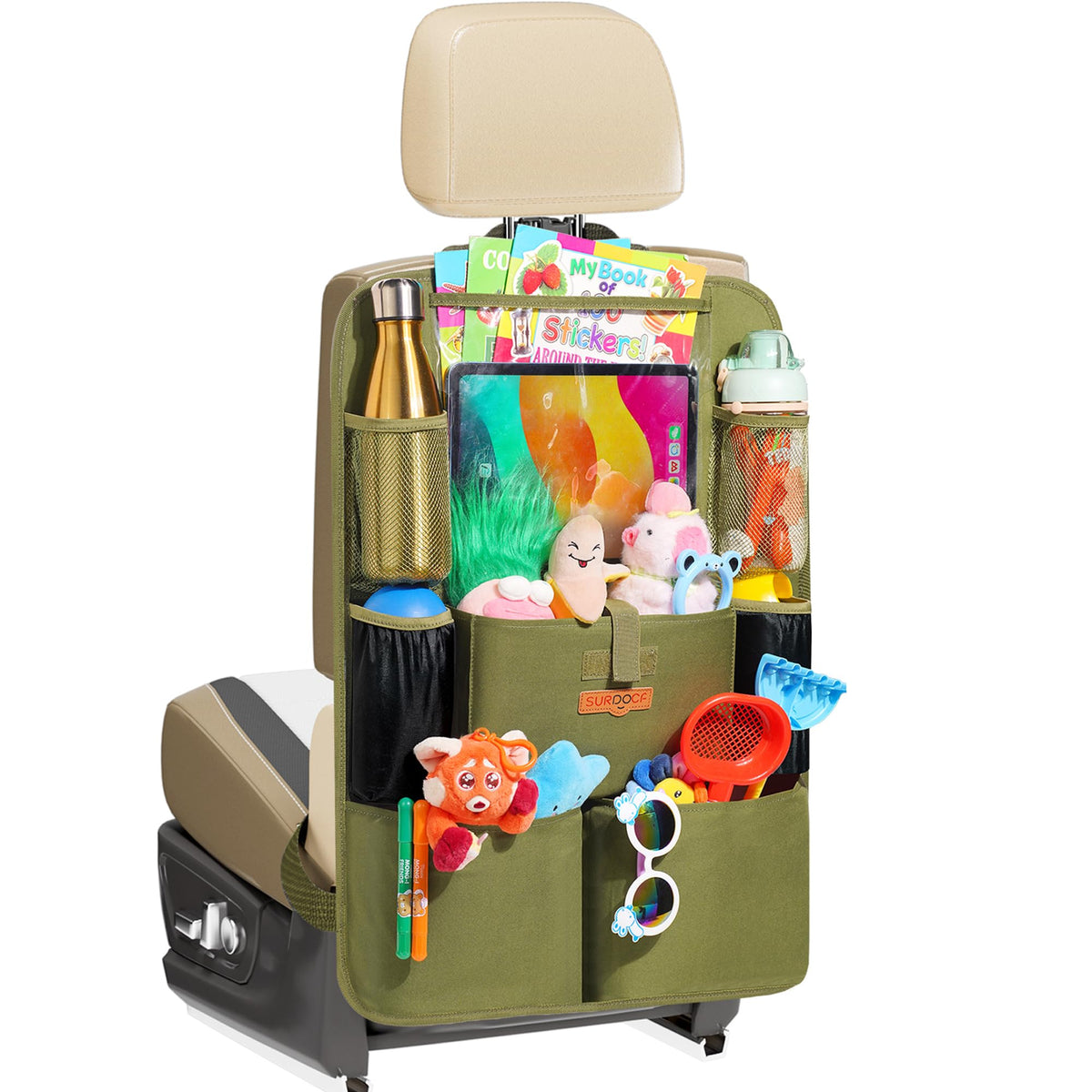 UPGRADED & REINFORCED - SURDOCA car seat organiser is constantly being improved, thicker and sturdier 600D Oxford fabric, improved sewing process to solve pocket tearing issues, larger and thicker TPU material for the touchable tablet pocket, longer bottom straps and increased overall size, stronger clasps, and more | 2-IN-1 FUNCTIONALITY - With 9 different pockets, our back seat organiser provides ample storage space, keeping your car clean and organized. Made of waterproof and dirt-resistant 600D Oxford fabric, it also doubles as a kick mat to protect your car seats from dirty little feet, ensuring a comfortable and worry-free travel experience | EFFORTLESS INSTALLATION AND CLEANING - SURDOCA car organization features adjustable straps that can be secured to 99% of car seats, making it easy to install and compatible with most car models. With excellent dirt resistance, our backseat organizer effortlessly maintains its pristine appearance through a simple wipe, making it look as good as new. | HIGH-QUALITY TPU MATERIAL - Touchable tablet pocket is made of TPU material that provides better transparency, does not distort screens, and has a better touch feel, even in high temperatures doesn 't emit any chemical odor. The 10.5-inch size is suitable for most tablets, and is equipped with earphones and charging holes | STURDY & DURABLE - Our car organizer backseat is made of thicker and stronger 600D Oxford fabric, which provides greater rigidity, is waterproof and dirt-resistant, and has an increased overall size of 25x17.2in (63x44cm), ensuring complete protection of your car seats