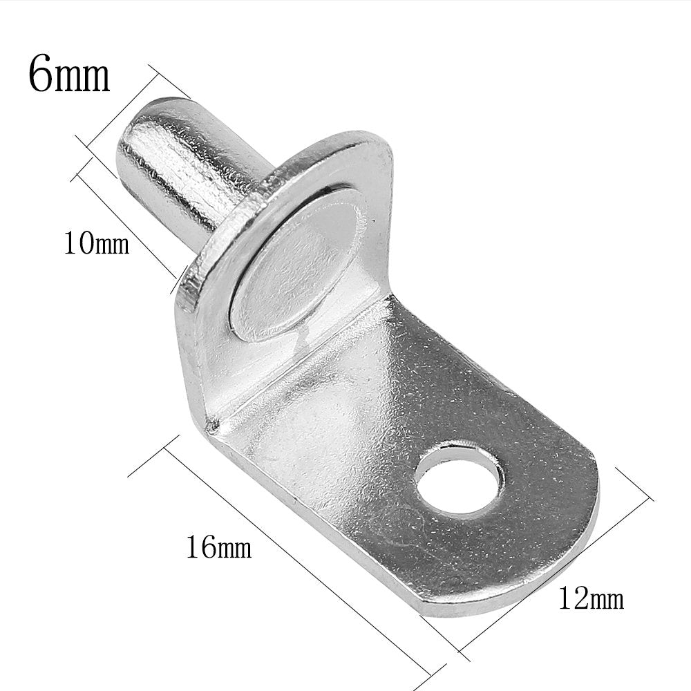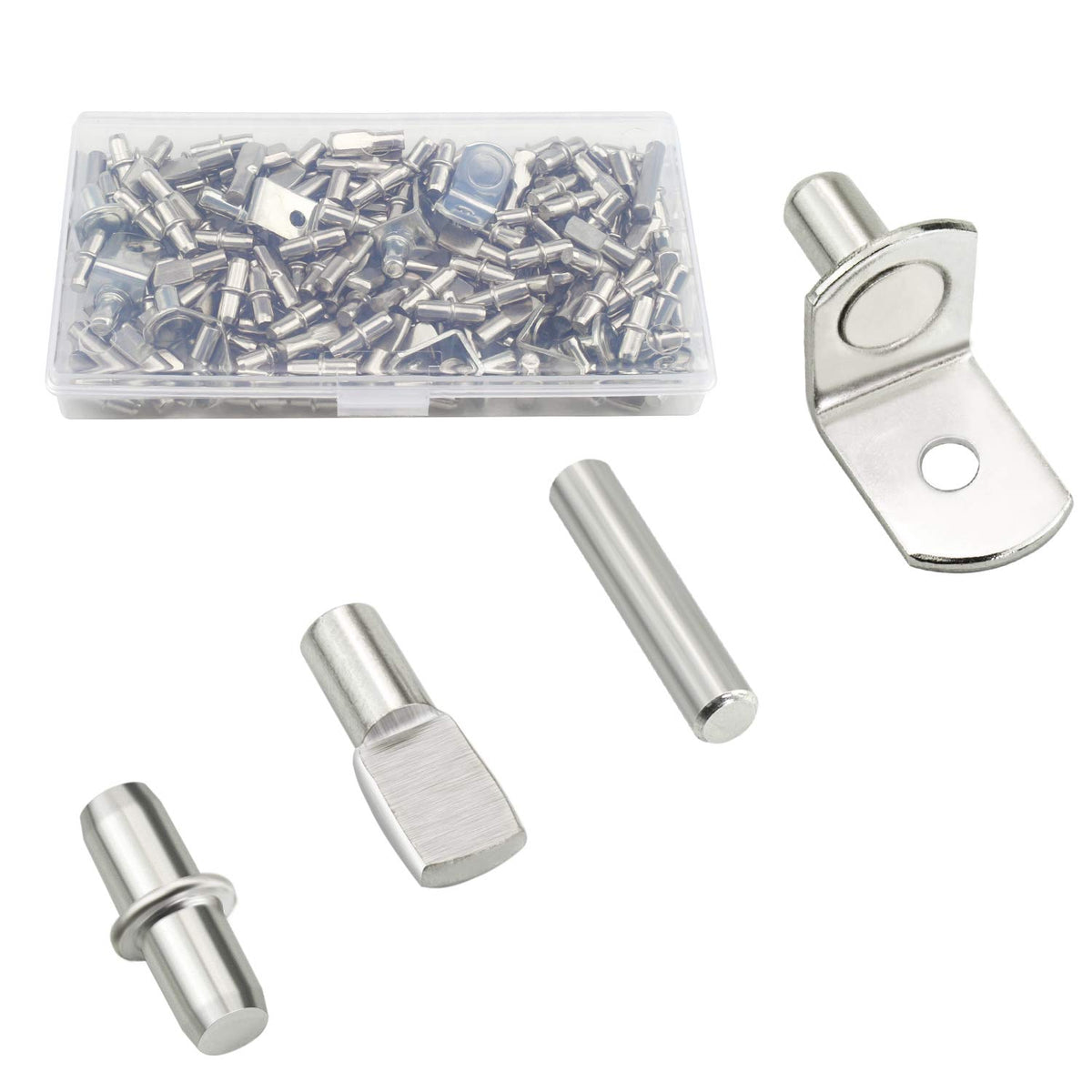 Specifications: - Color: Silver - Package: 100 PCS - Material: Stainless steel and iron with nickel plated - Size: 5mm Nickel Shelf Pins, Fit hole size: 5mm shelf holes - Type: Bracket style, flat spoon style, cylindrical shaped, dowel pin style - Application: These shelf support pins can fit 5 mm and 6 mm shelf holes on cabinets, entertainment centers, bookcases, etc.