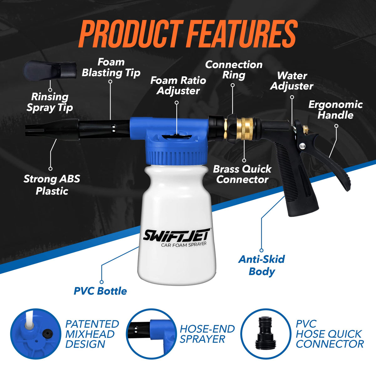 Swiftjet Car Wash Foam Gun + Microfiber Wash Mitt - Car Foam Sprayer - Car Wash Kit - Foam Cannon Garden Hose Sprayer - - Car Accessories For Men - Snow Foam Blaster (Blue Foam Gun With Mitt)