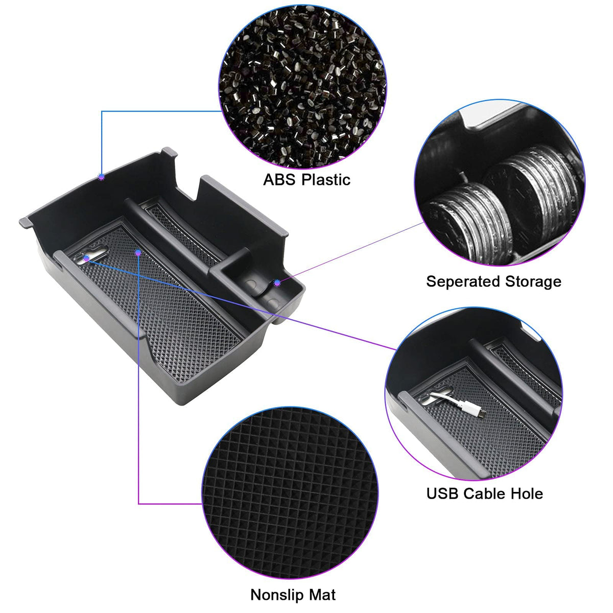 Q: What materials is the console organizer made from?A: The console organizer is made from high-quality Acrylonitrile Butadiene Styrene (ABS) plastic, which is known for its durability and strength, making it perfect for long-term use in your vehicle.