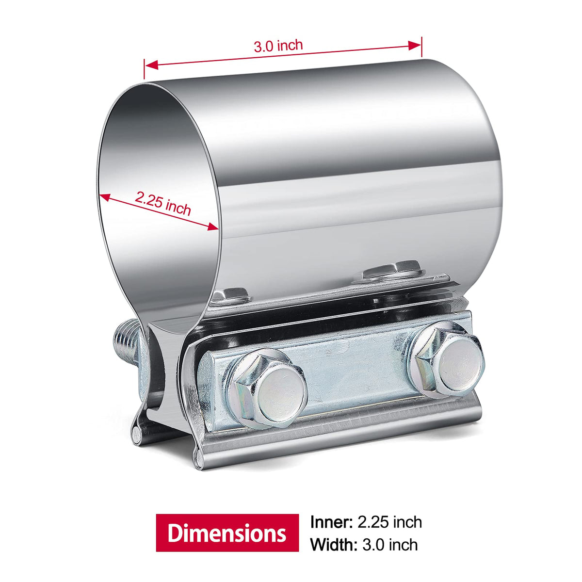 Q: What size pipes does the SYKRSS exhaust clamp fit?A: The SYKRSS 2.25" Stainless Steel Butt Joint Exhaust Seal Band Clamp is designed to fit pipes with an outer diameter of 2.25 inches, making it suitable for connecting 2.25" OD exhaust pipes, mufflers, and similar components.