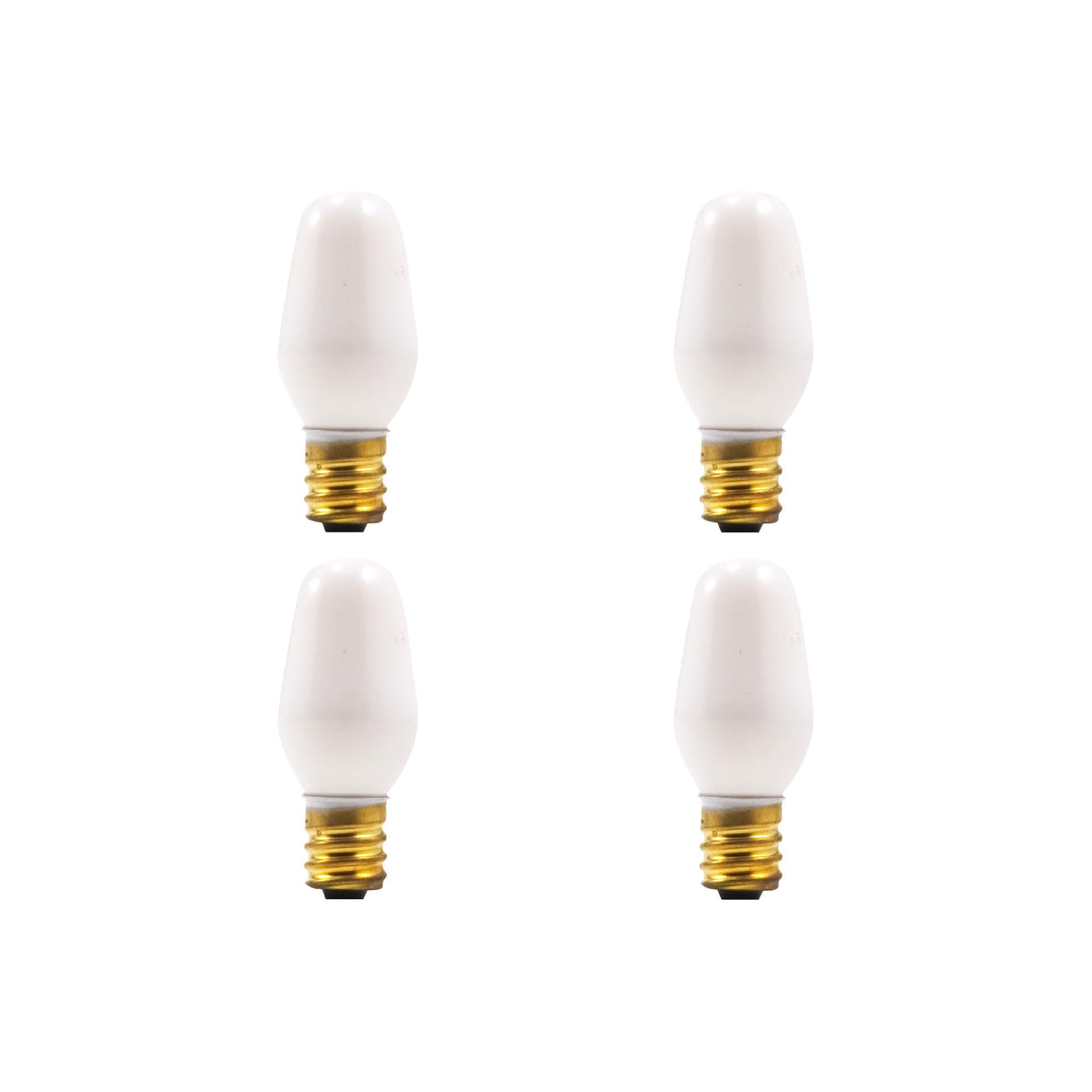 Q: How many bulbs come in a pack, and what is their size?A: This product comes in a pack of 4 C7 light bulbs, with each bulb measuring 0.88 inches in length and width.