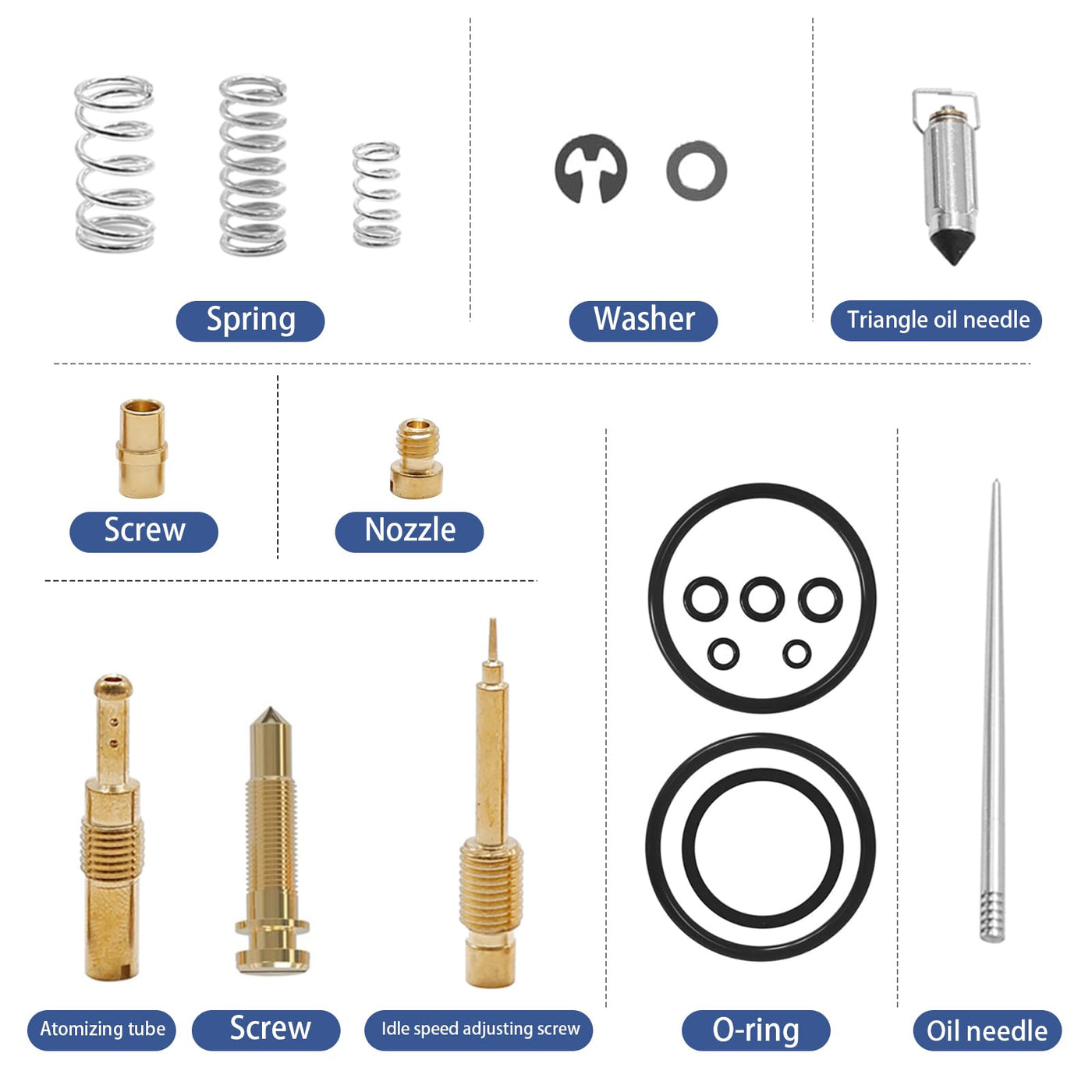 Q: What components are included in the carburetor rebuild kit?A: The kit includes all necessary components required to restore your carburetor's performance, ensuring optimal fuel delivery and engine efficiency.