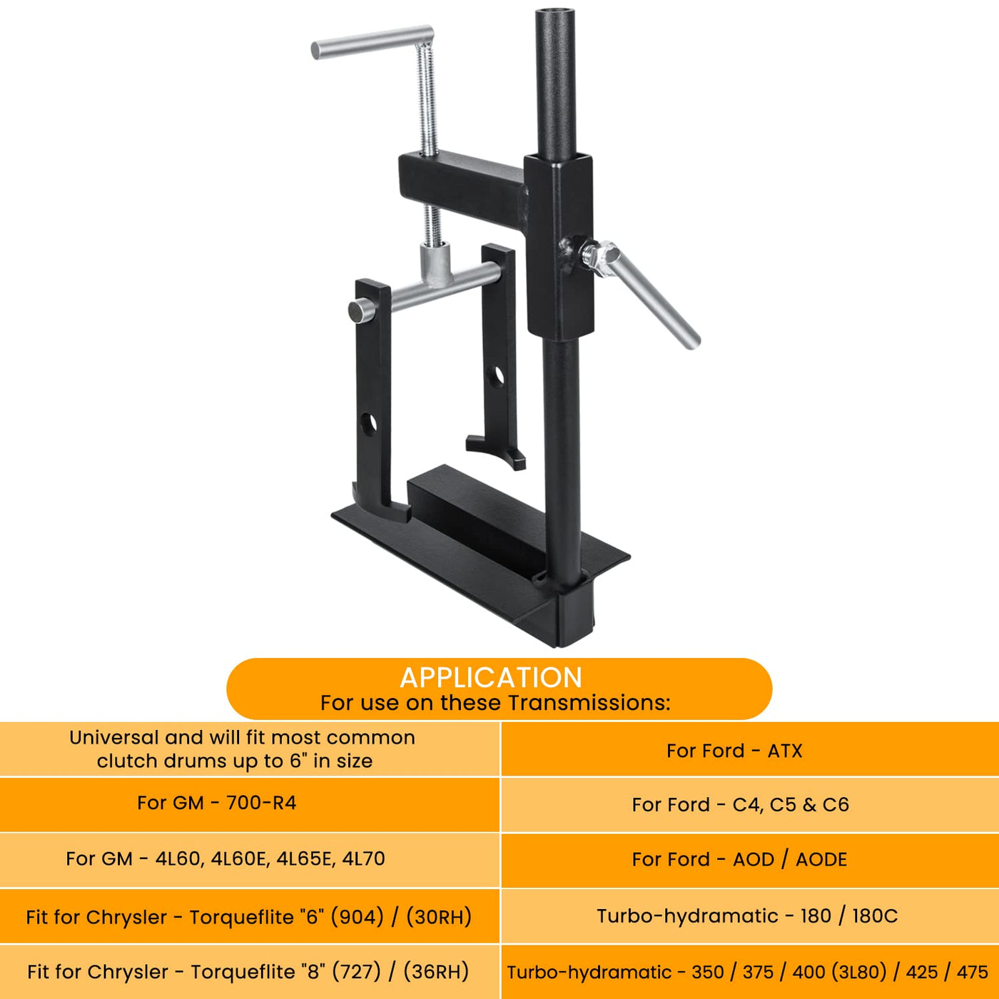 For Use On These Transmissions: Universal And Will Fit Most Common Clutch Drums Up To 6' In Size. Turbo-Hydramatic - 180 / 180C Turbo-Hydramatic - 350 / 375 / 400 (3L80) / 425 / 475 Ford - C4, C5 & C6 Ford - Aod / Aode Ford - Atx Fit For Chrysler - Torqueflite '6' (904) / (30Rh) Fit For Chrysler - Torqueflite '8' (727) / (36Rh) Gm - 700-R4 (Must Be Out Of Case. If You Are Working With It In The Case You Will Need A T-0149.) Gm - 4L60, 4L60E, 4L65E, 4L70