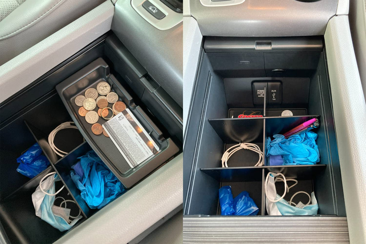 Q: How does the organizer improve my vehicle's storage?A: The TACOBRO Organizer maximizes the storage space in your center console, allowing you to keep items organized and preventing them from rolling around. It includes interlocking dividers for customized organization.