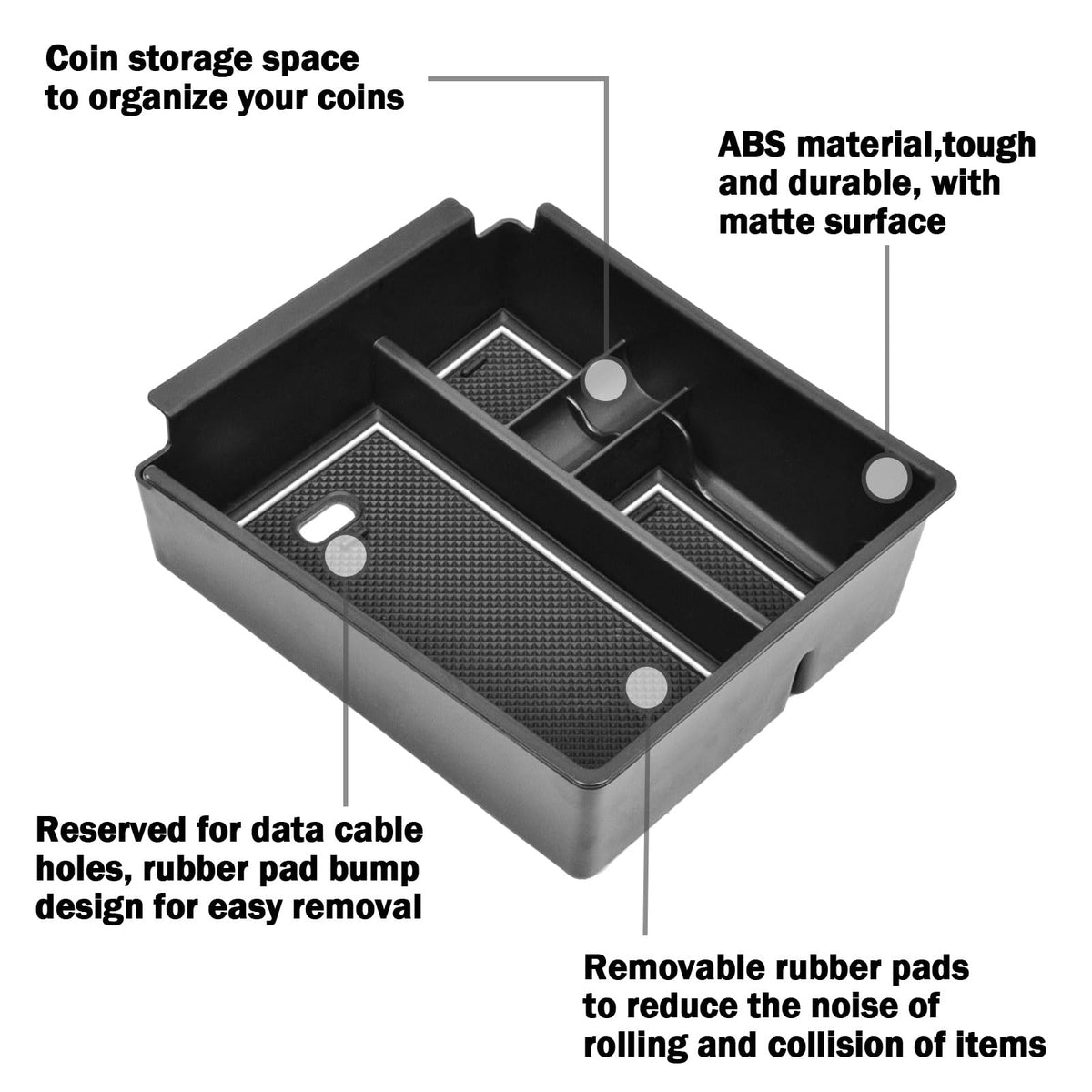 Q: What materials are used in the TACORBO Center Console Organizer?A: The organizer is made from durable ABS plastic, known for its toughness and longevity. It also comes with removable rubber pads that enhance grip and reduce noise from collisions, making it a practical choice for your vehicle.