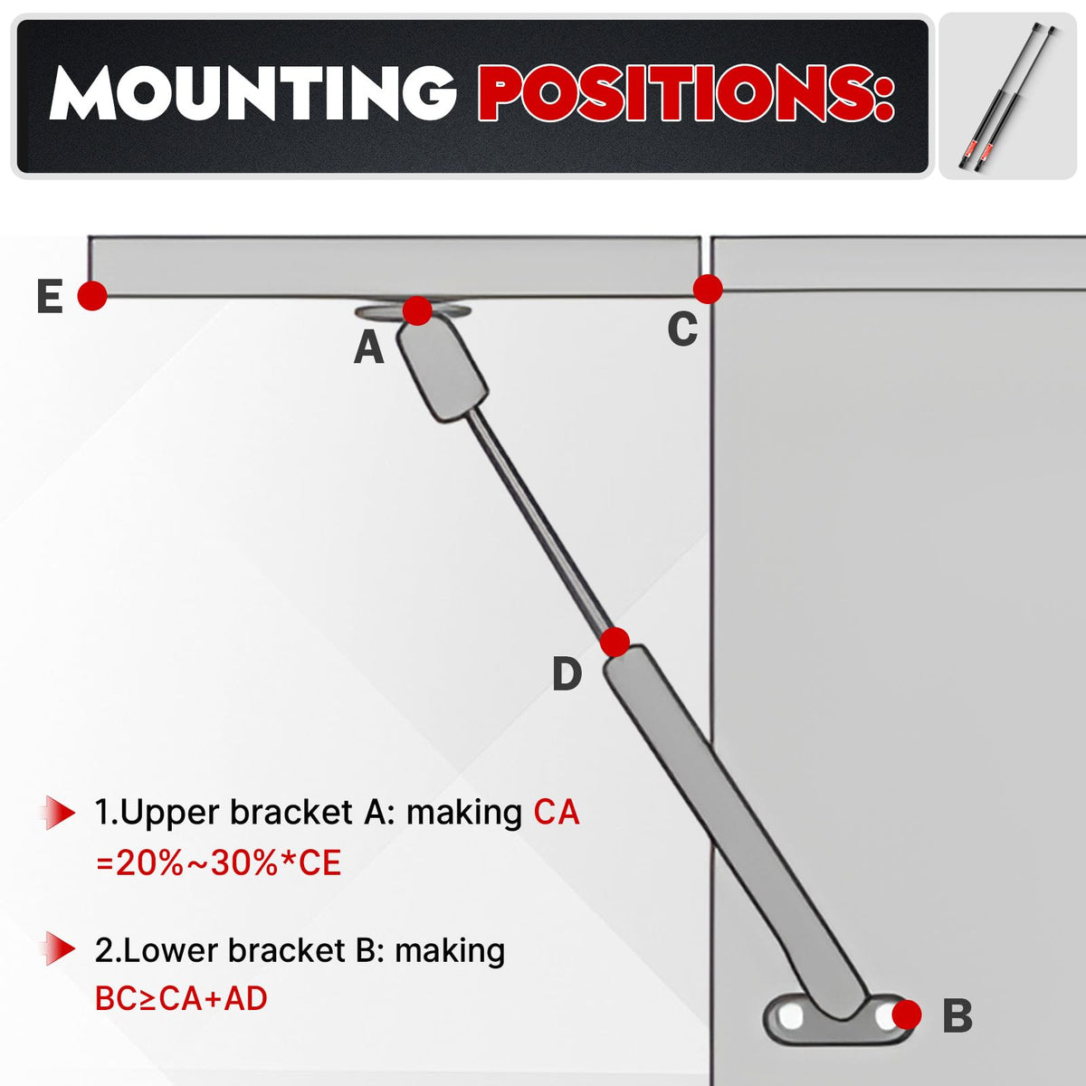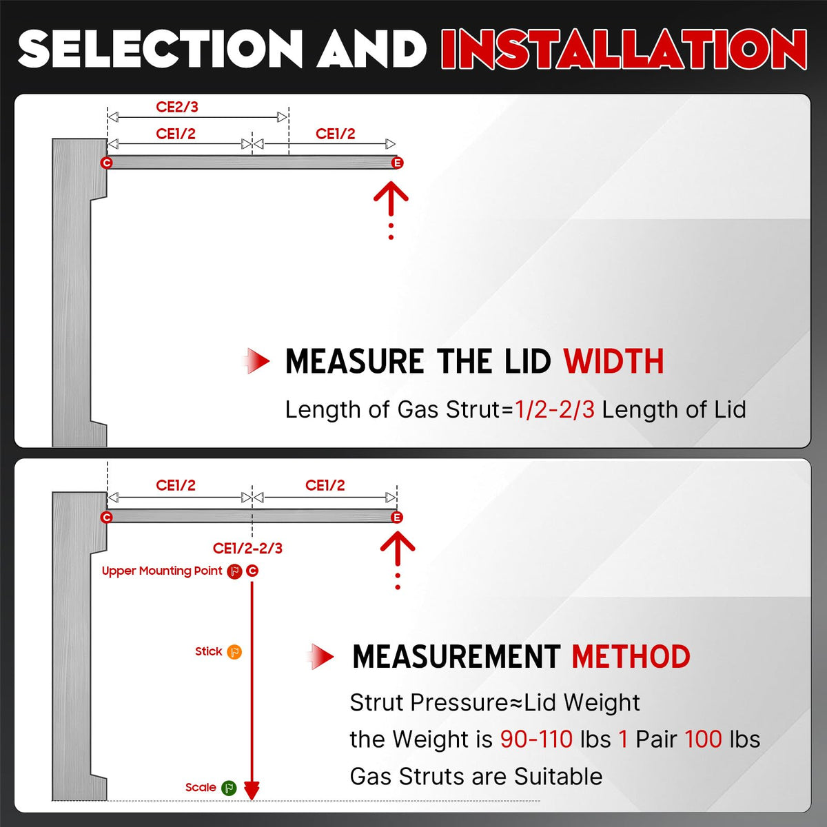 ? Specifications: Ext. Length: 14.45 inch; Comp. Length: 8.98 inch, Force: 24 Pounds Per Strut ? Recommended weight range: Most suitable support lid weight is 18-26 pounds !!! If the lid weight is less than 18 lbs or more than 26 pounds, please choose other pressure struts!!! ? Installation: The package contains 2 pillars and 4 ball studs. Do not try to squeeze by hand, otherwise the pillars will be damaged. ? Interchange Part Number: C16-04154, C1604154 ? Kind Reminder: If you feel it is too powerful to close and you have a lot of flexibility in where they can mount, you can move the mount point on the lid towards the hinges' direction.