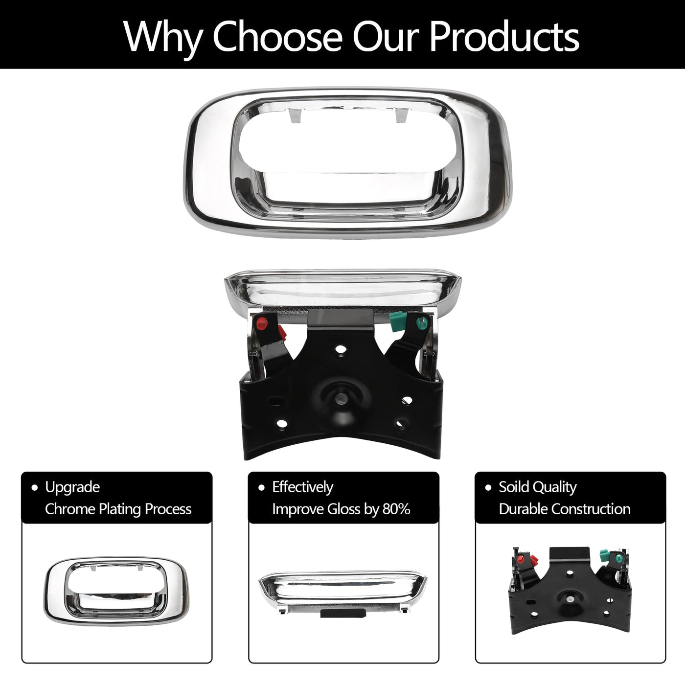 Q: How does the chrome plating improve the product?A: The upgrade chrome plating process enhances the gloss of the handle by 80% and provides resistance against oxidation and scratches. This ensures a long-lasting finish that keeps your tailgate looking shiny and new, making it a great aesthetic upgrade for your vehicle.