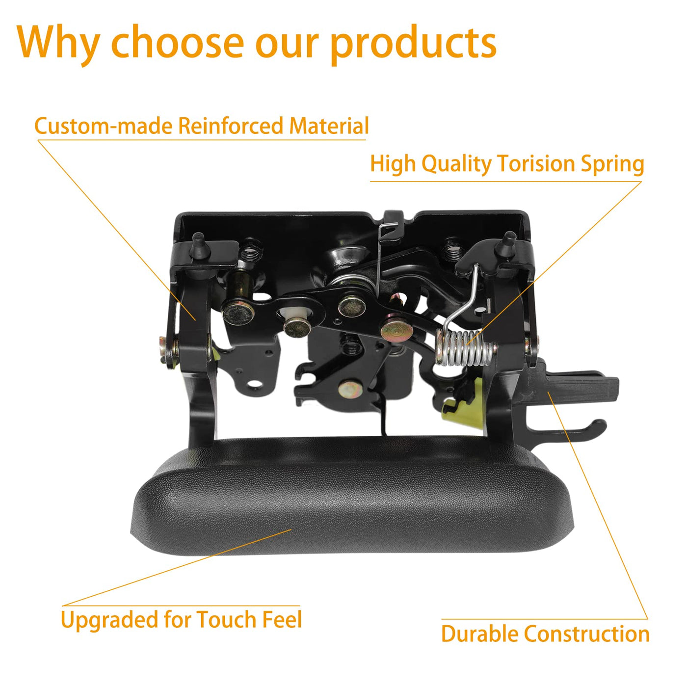 Q: What materials are used in the construction of this tailgate handle?A: This tailgate door handle is made from reinforced ABS plastic and steel, ensuring durability and a long lifespan. The internal components, such as the bolt and spring, are made of hardened steel for added strength.