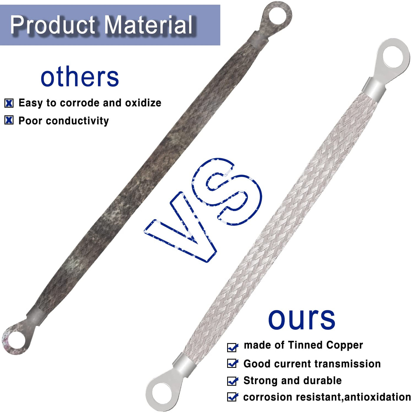 Q: What is the material used for these grounding straps?A: These grounding straps are made from tinned copper, which ensures high conductivity and resistance to corrosion, enhancing their durability and performance.