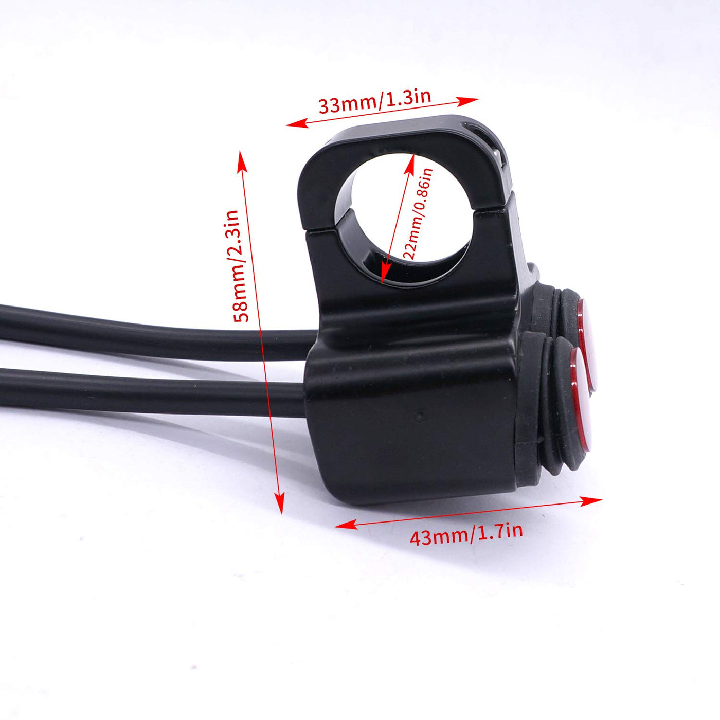 Q: What features does the Taiss Motorcycle Switch have?A: The switch features a red pilot lamp that illuminates when the switch is turned on. Its aluminum alloy construction ensures durability, and it has a total size of 49 x 58 x 43mm with a connecting line length of 55cm.