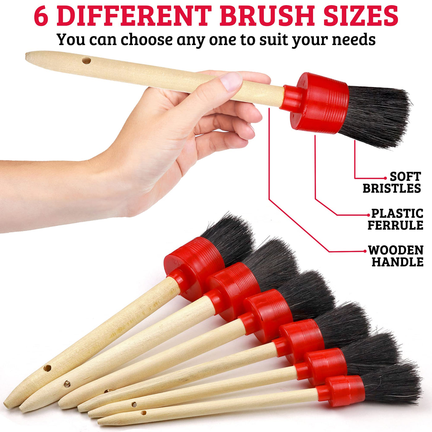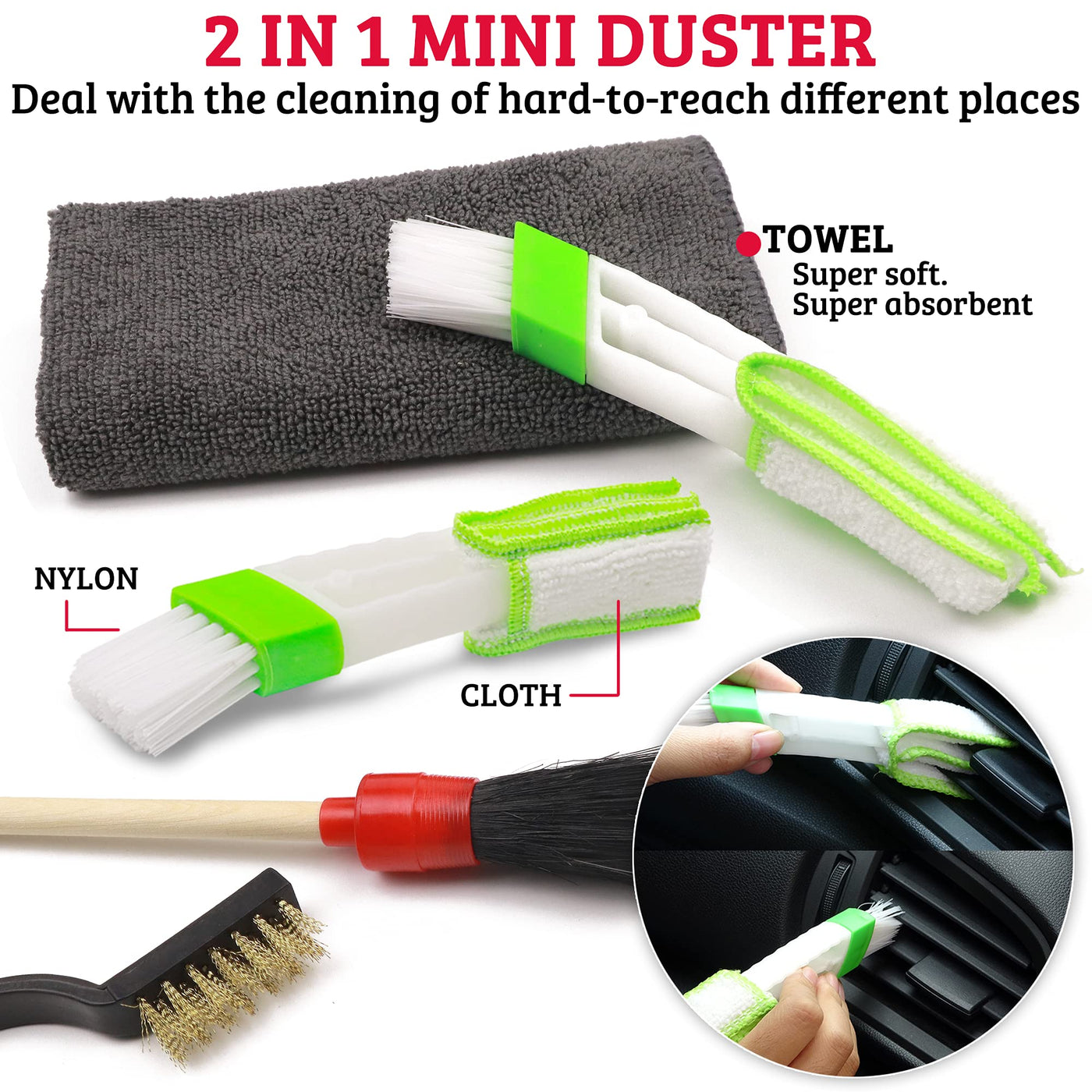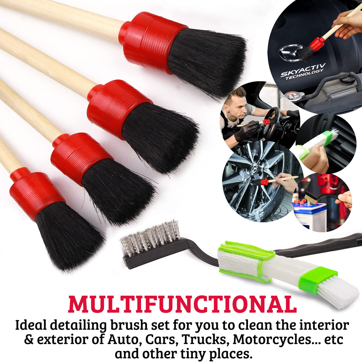 Strong>Takavu Auto Detailing Brush Kitstrong> Dense Anti-Shedding Bristles: The Detailing Brush Bristles Are Durable And Don&Rsquot Fall Out Even After Repeated Cycles Of Detailing &Nbspround-Shaped Brush Head Is Thick, Able To Hold A Good Amount Of Soapy Water For More Cleaning Action They Do Not Emit An Unpleasant Odor Great For Wet And Dry Use, Making Your Detailing Job Convenient, Can Be Reused Again And Again Flexible Nylon Hair Detail Brushes: Featured With Soft Bristles, Auto Detailing Brush Combines Perfect Strength And Flexibility Stiff Enough To Agitate Dirt, Grime, Dust, Debris Off Easily, But Soft Enough To Not Leave Scratches On Painted, Powder Coated, And Polished Surface Ergonomic Handle With Hanging Hole: The Hanging Hole Is Convenient To Hang So That You Can Store The Detailing Brush Easily And Keep Them Handy Each Has Its Number Marked To Help You Distinguish The Sizes The Ergonomic Handle Is Very Comfortable To Grip Your Hands Will Not Get Fatigue While Detailing The Wooden Handle Is Corrosion Resistant With Plastic Ferrule Preventing Scratching If You Accidentally Hit The Surface, Making It The Safest Detail Brush For Your Vehicle Perfect Sizes For Various Needs: There Are 6 Auto Detailing Brush Sizes The Smaller Are Ideal For The Hard To Reach Places, Crevices, Nooks And Crannies The Larger Are Good For Exterior And Wider Area More Efficiently The Detailing Brush Set Is Perfect For Cleaning Cars Interior And Exterior Like: Car Seat, Wheels, Engine Bay, Air Vents, Emblems, Rims, Grilles, Lug Nuts, Dashboard, Tire Rubbers Convenient & Time Saving: This Blinds Duster Is Made Of Sturdy Polyethylene Radian Arms Design Helps Reach Deep Into Ac Vent Finds, Pick Up Dust Easier And Quicker Dust Collector Cleaner Cloth Has A Small Groove On The Top Allowing You To Press Easily The Air Vent Brush Pads Are Soft And Comfortable It Can Be Removed And Reused Multipurpose: Stainless&Nbsp