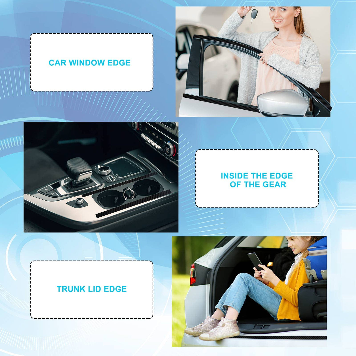 Q: How do I install the carbon fiber door protectors?A: The installation of the carbon fiber door protectors is straightforward. Simply clean the surface where you intend to apply the protector, measure and cut the tape to your desired length, then peel off the adhesive backing and firmly press the tape onto the surface. The protector is designed to be easy to remove without leaving any residue.
