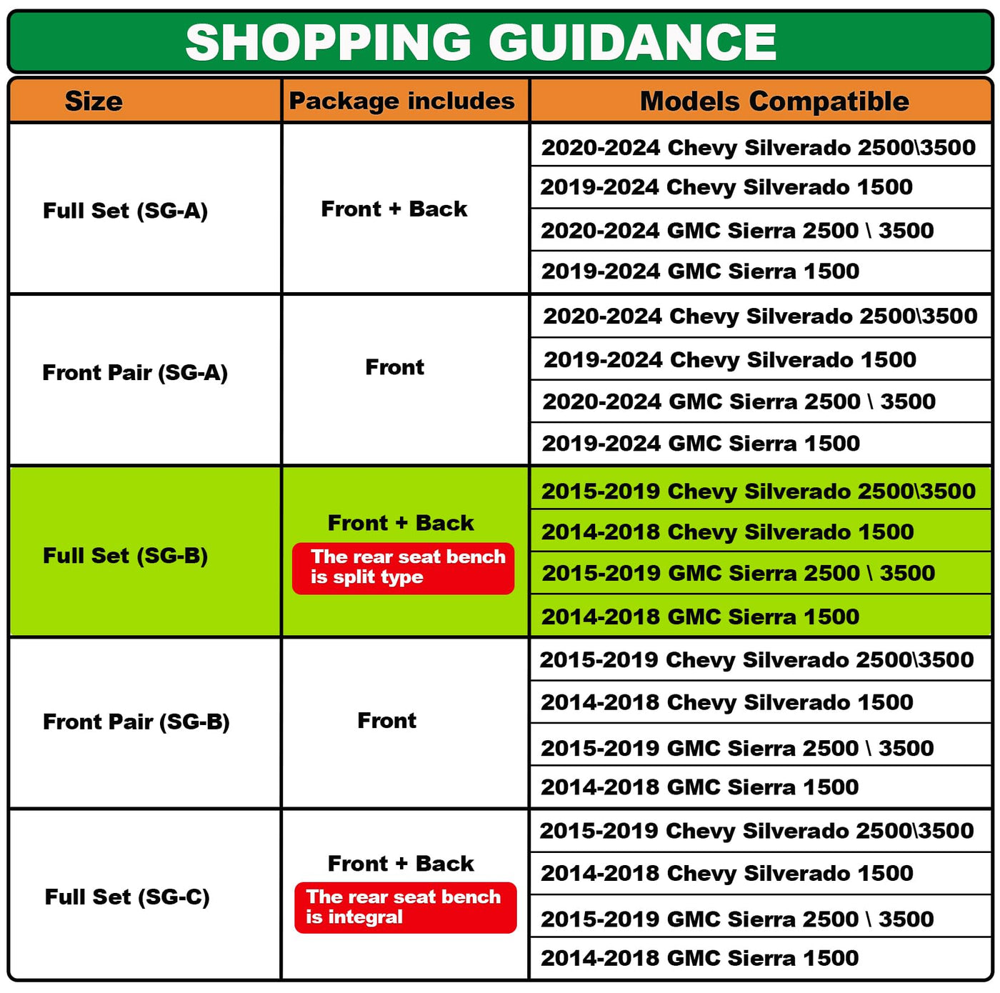 Q: What is the difference between the Full Set (SG-B) and other sizes?A: The Full Set (SG-B) includes covers for both front and back seats, specifically fitting models with a split rear seat cushion. This differs from other sizes which may only cover front seats or have different rear seat configurations.