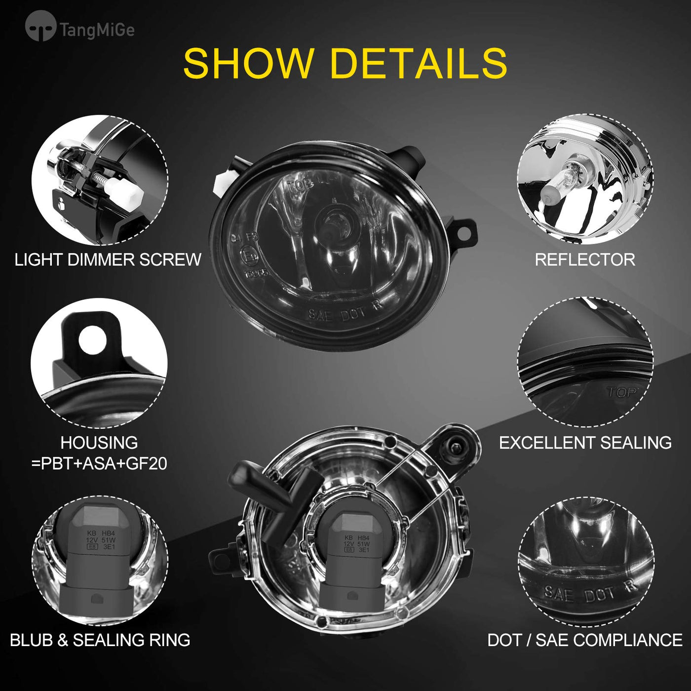 Q: What type of bulbs do the TangMiGe Fog Lights use?A: The TangMiGe Fog Lights utilize HB4 9006 halogen 12V 55W bulbs, which are included in the assembly. These bulbs are known for their brightness and reliability, enhancing visibility in poor weather conditions.