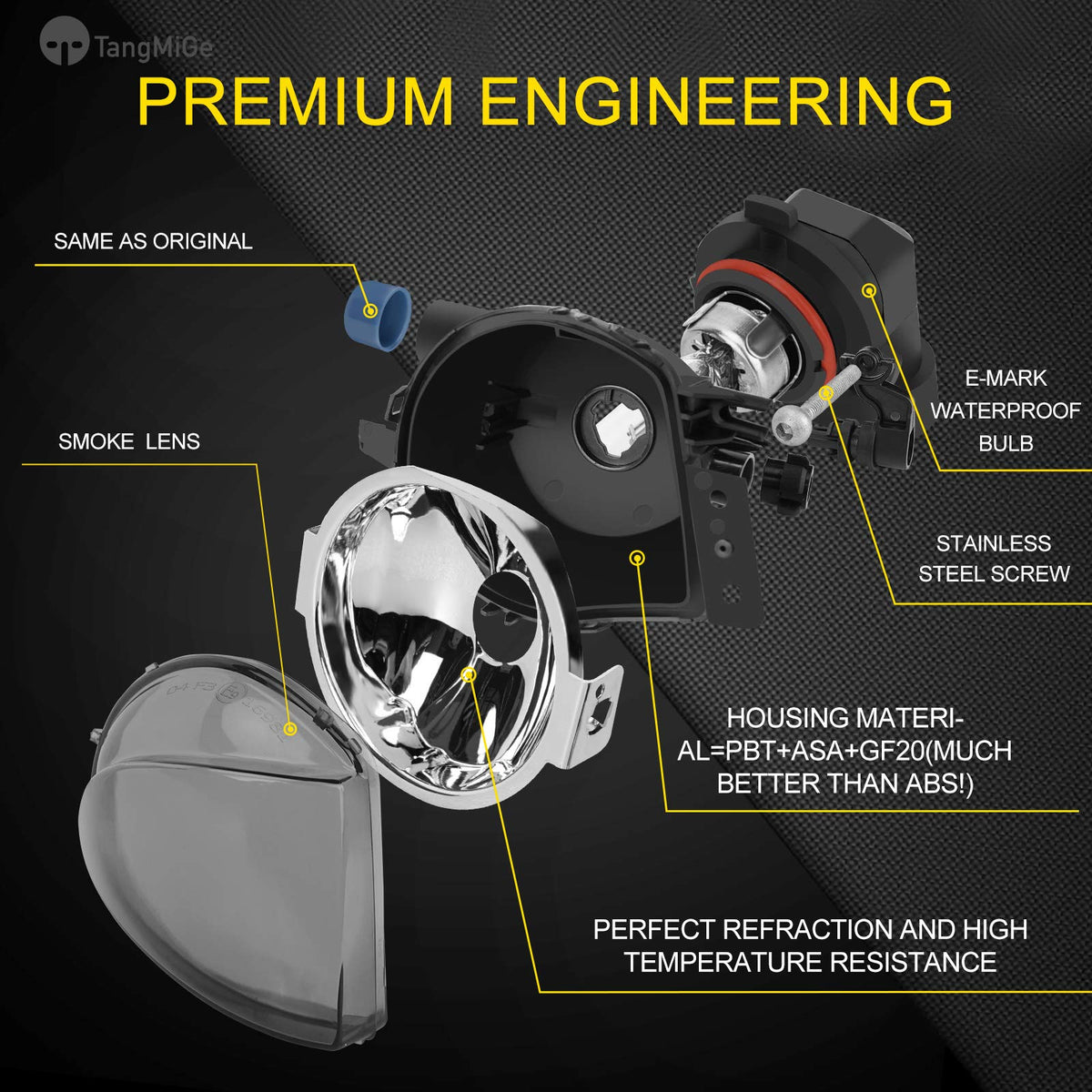Q: What materials are used in the construction of the fog lights?A: The TangMiGe Fog Lights are constructed using high-quality materials, including PBT+ASA+GF20, which is significantly better than traditional ABS. This durable construction helps prevent moisture and dust from entering the housing, ensuring longevity and reliability.