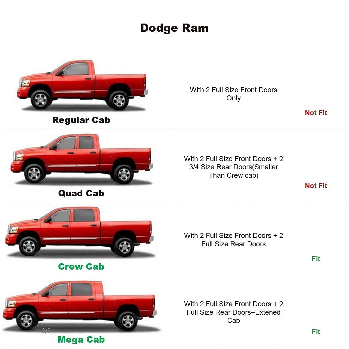 The Rain Guards & Vent Deflectors Fit 2009 2010 Dodge Ram 1500 Crew Cab Only (Not Fit Quad Cab). 2011-2018 Ram 1500 Crew Cab Only (Not Fit Quad Cab). 2010 Dodge Ram 2500/3500 Crew Cab Only (Not Fit Mega Cab). 2011-2018 Ram 2500/3500 Crew Cab Only (Not Fit Mega Cab) *Note:The crew cab has 4 full size doors.This item will not be compatible with quad or mega cab . Position: 2pcs for side car window front doors and 2pcs for rear doors. Package Included: 4pcs vent guards window visors (Installation instruction is included,plz refer to the picture in the listing for details) . style:Tape-On Style (Stick on to the door & above the windows.Not In-Channel Style)
