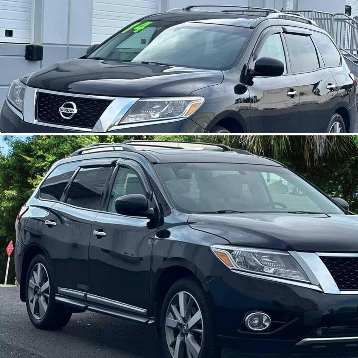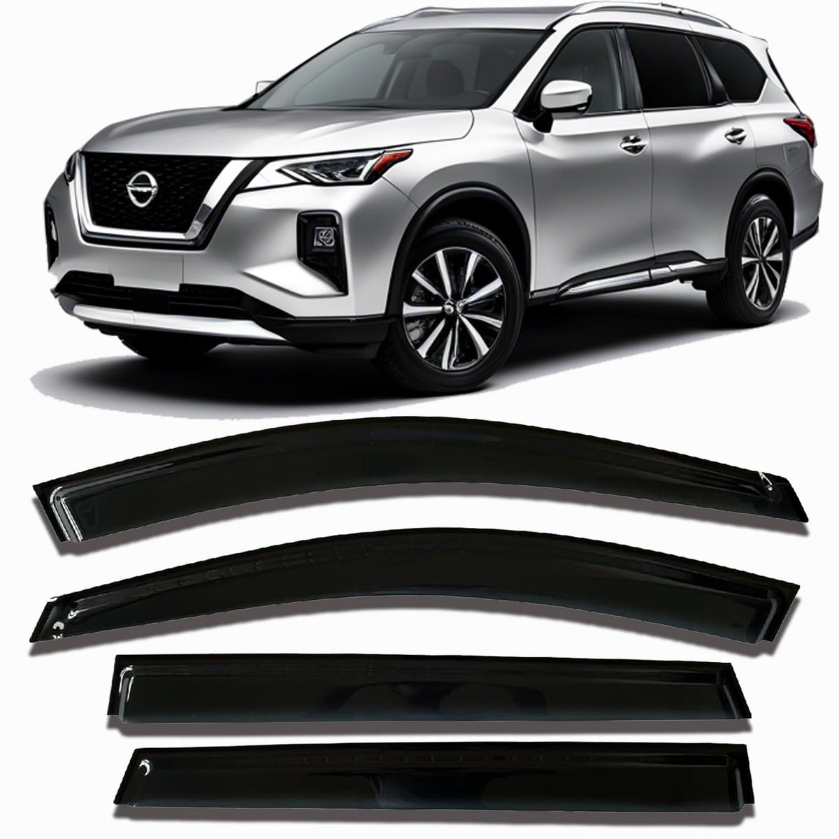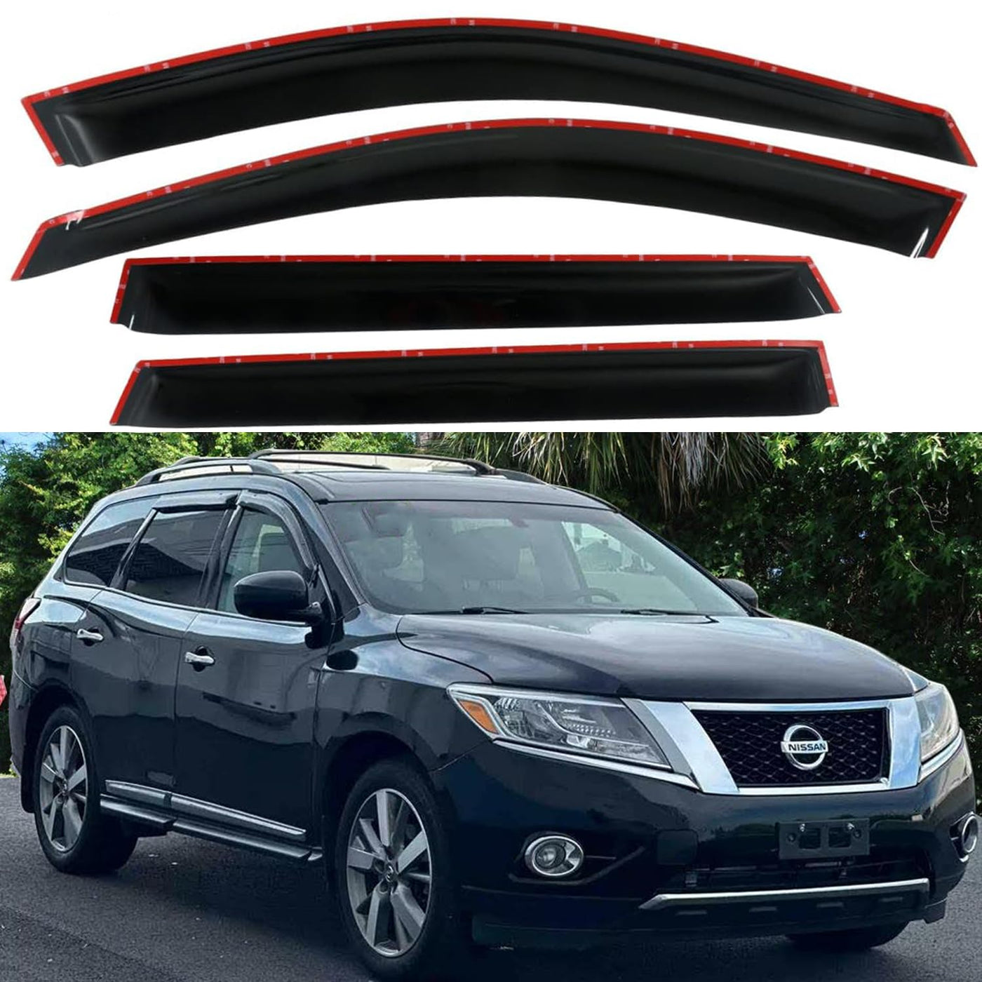 FitmentFor Nissan Pathfinder 2013+ Note: Crew cab model has 2 full size front doors and 2 full size rear doors that open in the same direction.Please check the display picture for more details about the cab difference. Item-Offered 4pcs vent sun shade window visors Style Outside Mount Style, Easy Peel-N-Stick Installation.