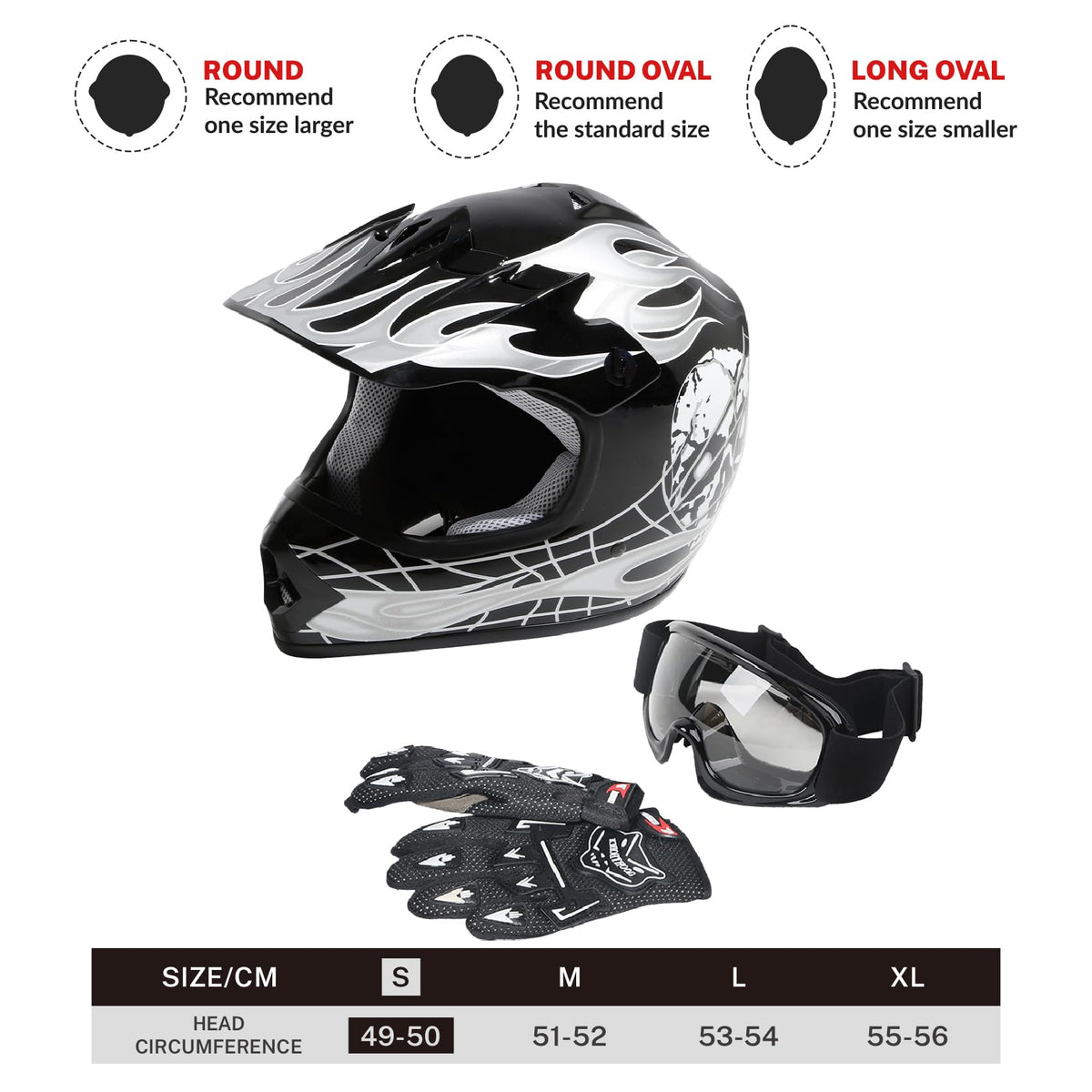 Description Conditon: Brand New Main Color: Black/Silver Helmet Size: Small/Medium/Large/Extra Large (Youth) Goggles Size: One Size(Youth) Gloves Size: One Size(Youth) Helmet Features: Beautiful Glossy Uv Protective Finished S/M/L/Xl Size For Youth Light Weight Extremely Durable Composite Shell Heavily Cushioned And Very Comfortable Interior Removable And Washable Padding Well Vented All Purpose Product For Summer Or Winter Riding Well Vented All Purpose Product For Off-Road Riding Dot Safety Standard Comes With A Helmet Bag New In Box Note: Please Measuring Your Head Before Bidding Wrap Clotg Tape Measure Around Head Approx. 1Cm Above Ears And 2Cm Above Eyebrows. (If You Donthave A Tape Measure, You Can Use A Piece Of String And Measure Using A Ruler.) Youth Size Chart S = 19.15-19.506 Inch M = 20.10-20.45 Inch L = 20.87-21.26 Inch Xl(=Adult S) = 21.65-22.5 Inch Size Guide To Ensure Proper Sizing, Please Do The Following: Take A Head Measurement With A Cloth Tape Measure. Wrap Tape Measure Around Your Head One Inch Or 25Mm Or 2.5Cm Above Your Eyebrows,Directly Above Your Ears And To The Widest Area At The Back Of Your Head. The Widest Measurement Will Give You Your Helmet Size. If You Donthave A Tape Measure, You Can Use A Piece Of String And Measure Using A Ruler. Package Included: -1X Helmet -1X Goggles -1 Pair Gloves -1Xhelmet Bag