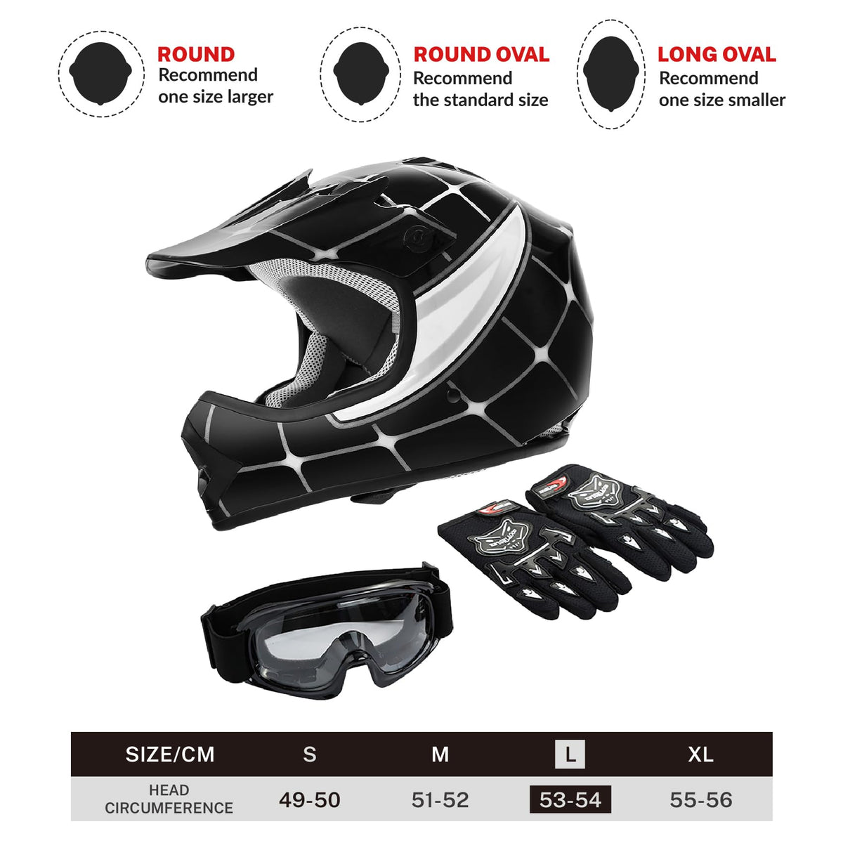 Description Conditon: Brand New Main Color: Black Spider Helmet Size: Small(Youth) Goggles Size: One Size(Youth) Gloves Size: One Size(Youth) Helmet Features: Beautiful Glossy Uv Protective Finished S/M/L/Xl Size For Youth Light Weight Extremely Durable Composite Shell Heavily Cushioned And Very Comfortable Interior Removable And Washable Padding Well Vented All Purpose Product For Summer Or Winter Riding Well Vented All Purpose Product For Off-Road Riding Dot Safety Standard Comes With A Helmet Bag New In Box Note: Please Measuring Your Head Before Biddingwrap Clotg Tape Measure Around Head Approx. 1Cm Above Ears And 2Cm Above Eyebrows. (If You Donthave A Tape Measure, You Can Use A Piece Of String And Measure Using A Ruler.) Youth Size Chart S = 19.15-19.506 Inch M = 20.10-20.45 Inch L = 20.87-21.26 Inch Xl(=Adult S) = 21.65-22.5 Inch Size Guide To Ensure Proper Sizing, Please Do The Following: Take A Head Measurement With A Cloth Tape Measure. Wrap Clotg Tape Measure Around Head Approx. 1Cm Above Ears And 2Cm Above Eyebrows. (If You Donthave A Tape Measure, You Can Use A Piece Of String And Measure Using A Ruler.) Package Included: -1X Helmet -1X Goggles -1 Pair Gloves -1Xhelmet Bag
