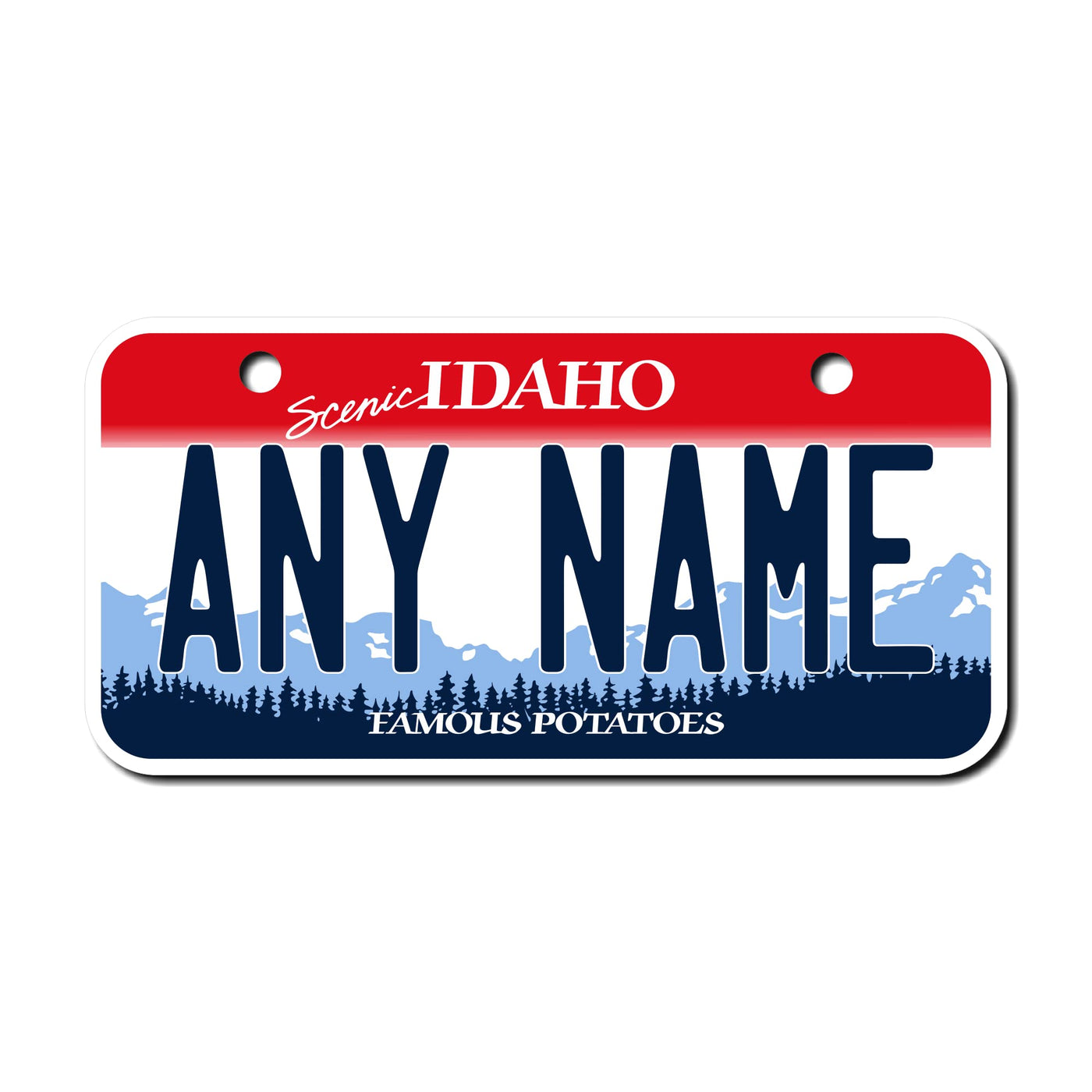 Personalized Idaho license plates. Offered in 5 sizes and Key Ring. Make s a great gift. Sizes for Bikes, bicycles, cars, trucks,ATV 's, wheelchairs, etc.