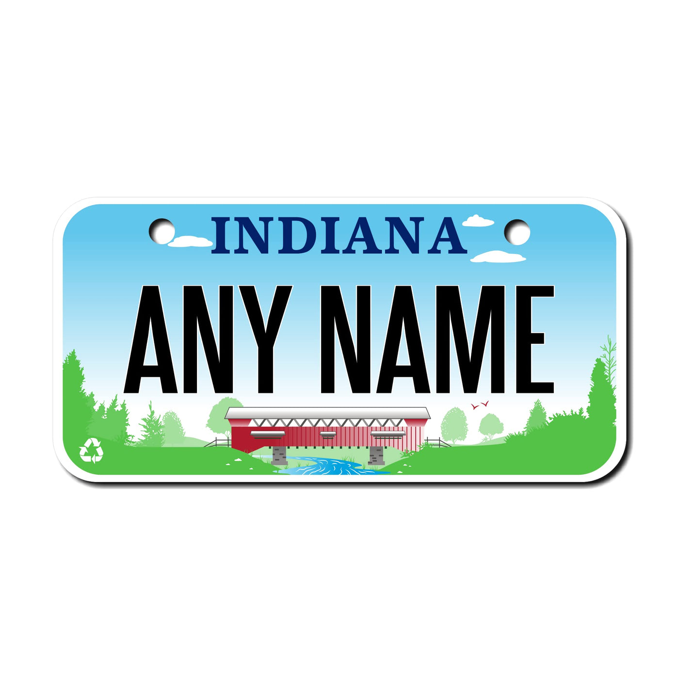 Personalized Indiana license plates. Offered in 5 sizes and Key Ring. Make s a great gift. Sizes for Bikes, bicycles, cars, trucks,ATV 's, wheelchairs, etc.
