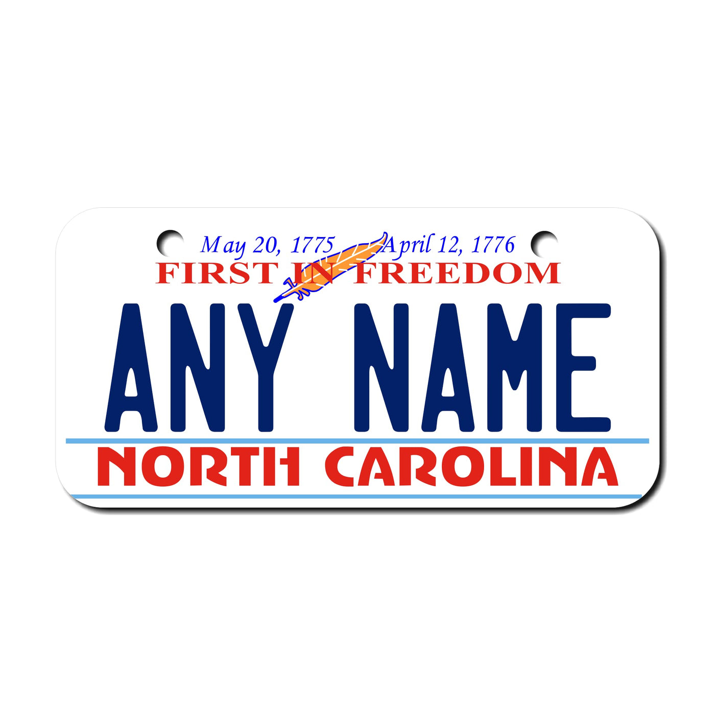 Personalized North Carolina License Plates. Offered In 5 Sizes And Key Ring. Make S A Great Gift. Sizes For Bikes, Bicycles, Cars, Trucks,Atv 'S, Wheelchairs, Etc.
