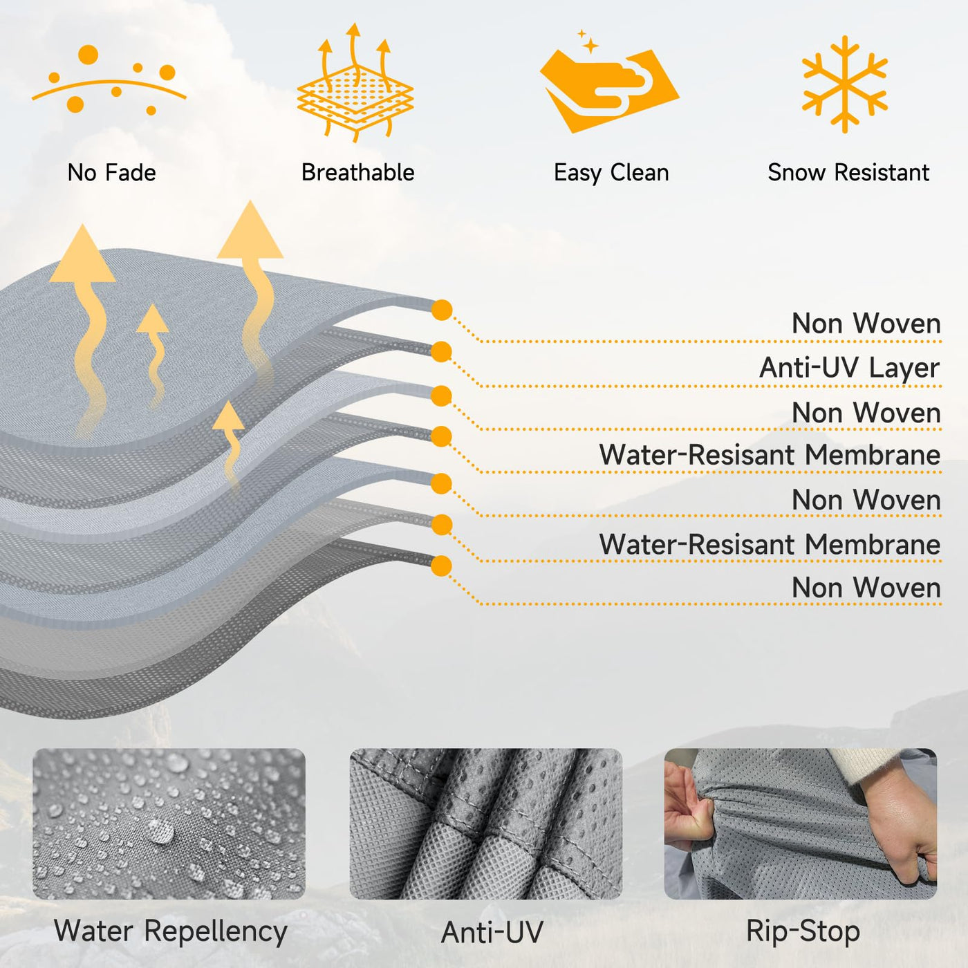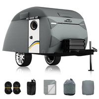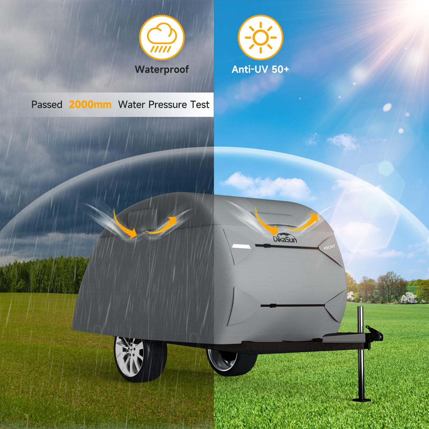 Q: Is this cover waterproof and suitable for different weather conditions?A: Yes, the DikaSun Teardrop Trailer Cover features 7 layers of waterproof protection, making it highly durable against harsh weather elements such as rain, wind, and UV rays.