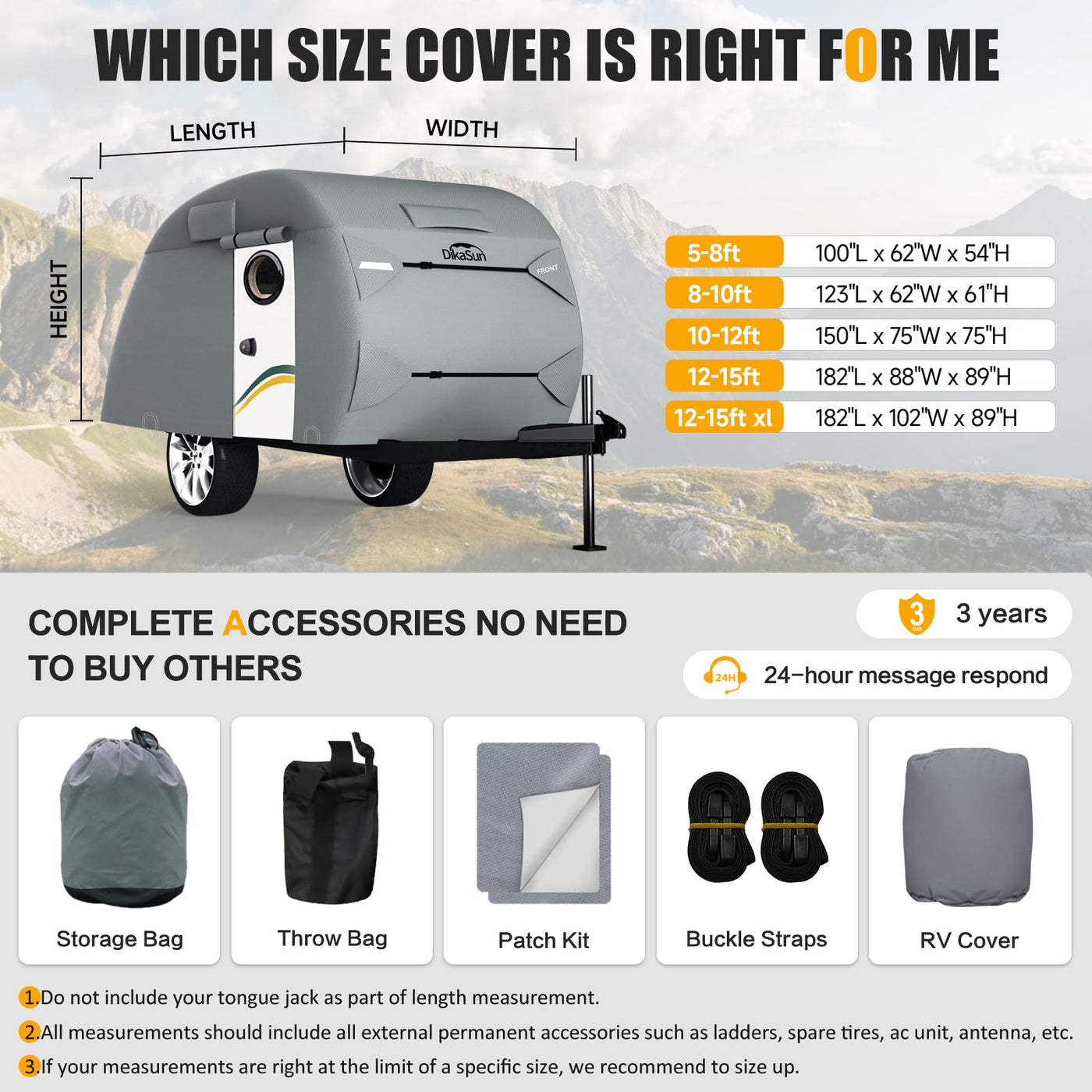Q: What warranty does the DikaSun Teardrop Trailer Cover come with?A: The DikaSun Teardrop Trailer Cover is backed by a comprehensive warranty program, ensuring that any manufacturing defects or issues will be promptly addressed, providing peace of mind regarding your investment.