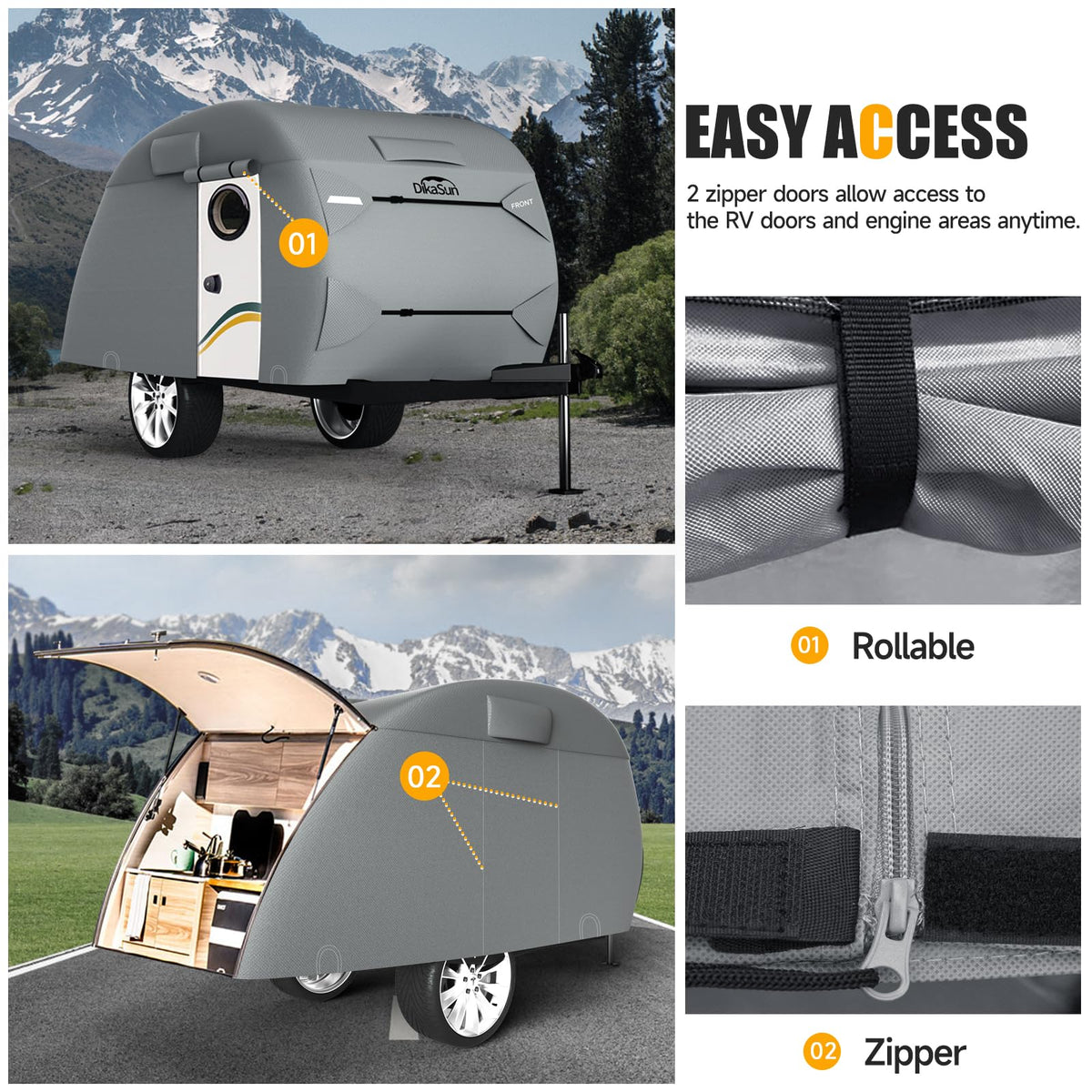 Q: How does the tear-resistant design of this cover benefit my trailer?A: The tear-resistant design of the DikaSun cover provides a sturdy shield for your travel trailer, reducing the risk of damage from accidental tears or scratches, which ensures reliable protection during outdoor storage.