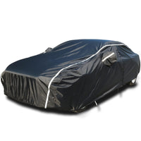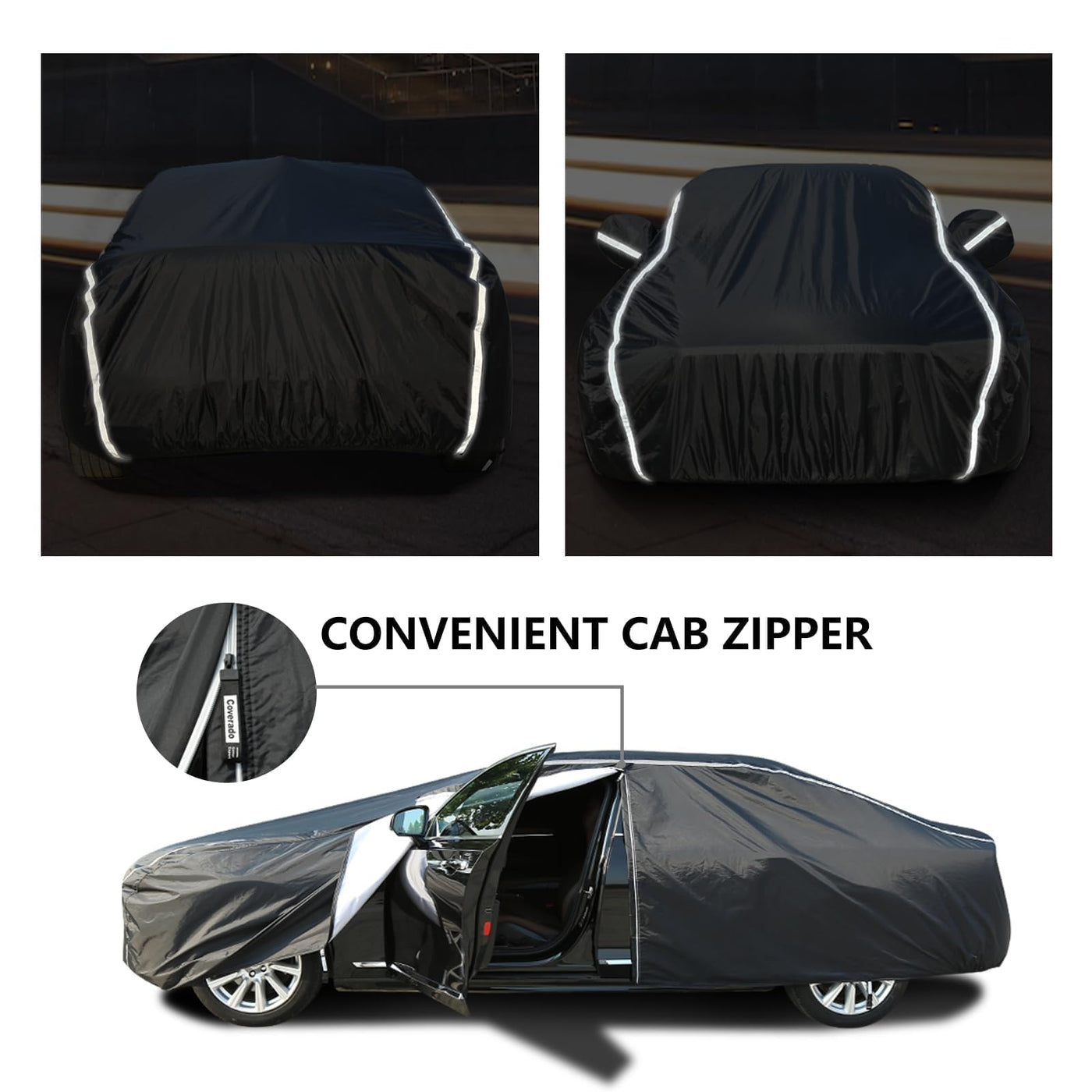 COMPATIBLE SIZE: Tecoom 3XXL car cover fits 191''-200'' length sedan. Please check car details before ordering - hatchback coupe or SUV; date of manufacture; vehicle overall length. | UNIQUE DESIGN: 1. The CAB DOOR ZIPPER on the left side of the cover for easy access. 2. The front, middle and rear windproof belts fix your car covers from being blown away by strong winds. 3. Large and long all-around reflective stripes on the car cover to remind others at night. 4. Tailor-made mirror pockets with reflective strips to make the car cover fit better. | PRACTICAL MATERIAL: The multi-layer thickened full car covers is made of 190T polyester. 1. PU coating is waterproof and tear-resistant. 2.The inner cotton of the cover is scratch resistant and protects your car paint. 3. High reflective polyester layer with good anti-UV and sun protection, keep your car interior cool all day. | COMPREHENSIVE PROTECTION: This car accessories protects your car all year round, just like a mobile garage. Wear-resistant and tear-resistant material protects your car from snow, frost, rain, sand, UV rays, dust, leaves, branches and bird falls. | TIPS: 1. Equipped with a portable storage bag, which is convenient for you to store the waterproof car cover. 2. Tecoom provides 12 months warranty. If the product you received is damaged or dirty, please contact us in time, and we will reply sincerely.