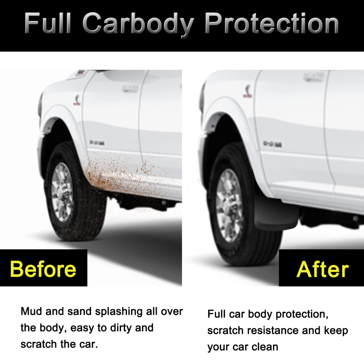 Custom Fit: These splash guards fenders compatible with 2019 2020 2021 Ram 2500/3500 trucks with OEM fender flares only and without the Power Wagon trim package. Manufactured in TS16949 certified facilities, each mud guard is manufactured by high precision model and is 100% OE compatibility tested for perfect fit | Top Grade Materials: The truck mud flaps made of top quality ABS thermoplastic materials, after rigorous tests ensure that the mud flaps is muddy water corrosion-resistance and work safe in all harsh environment | Thickening and Durable: Thickening design for off-road driving with impact strength up to 10 MPa, and tenacity additive keep the splash guards from deforming. These heavy duty solid mud flap protect your vehicle from mud, dirt, ice, gravel and road salt. Keep your vehicle clean and avoid frequent washing | Easy To Install: Set include front and rear mud guards (for both left and right side) with mounting hardware and mounting instruction for quick and easy install. No drilling required | 100% Customer Satisfaction: We stand by our products and the durable truck splash guards are no exception which is why we offer a 30-DAY MONEY-BACK GUARANTEE and 12 MONTHS WARRANTY. If you're unsatisfied with this item for any reason, we'll offer you a refund within 30 days