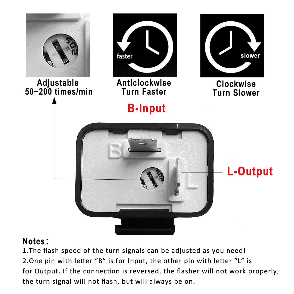 Q: What is the adjustable flash rate range of this relay?A: The flasher relay has an adjustable flash rate that ranges from 50 times per minute to 200 times per minute. You can easily adjust the speed by turning the dial clockwise for a slower rate or counterclockwise for a faster rate.