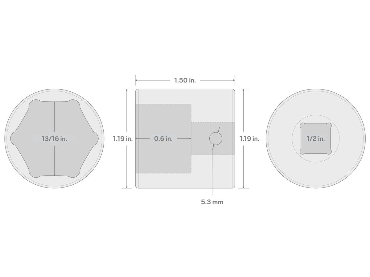 Q: What is the size of the TEKTON impact socket?A: The TEKTON impact socket is sized at 13/16 inches, designed to fit hex fasteners precisely.