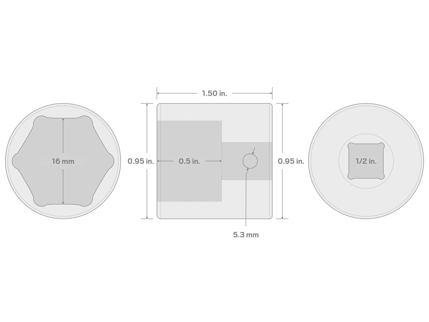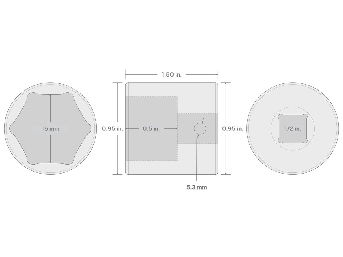 Q: What is the size of the TEKTON 1/2 Inch Drive x 16 mm Impact Socket?A: The TEKTON impact socket is designed to fit a 16 mm hex fastener, providing a precise fit for optimal performance.
