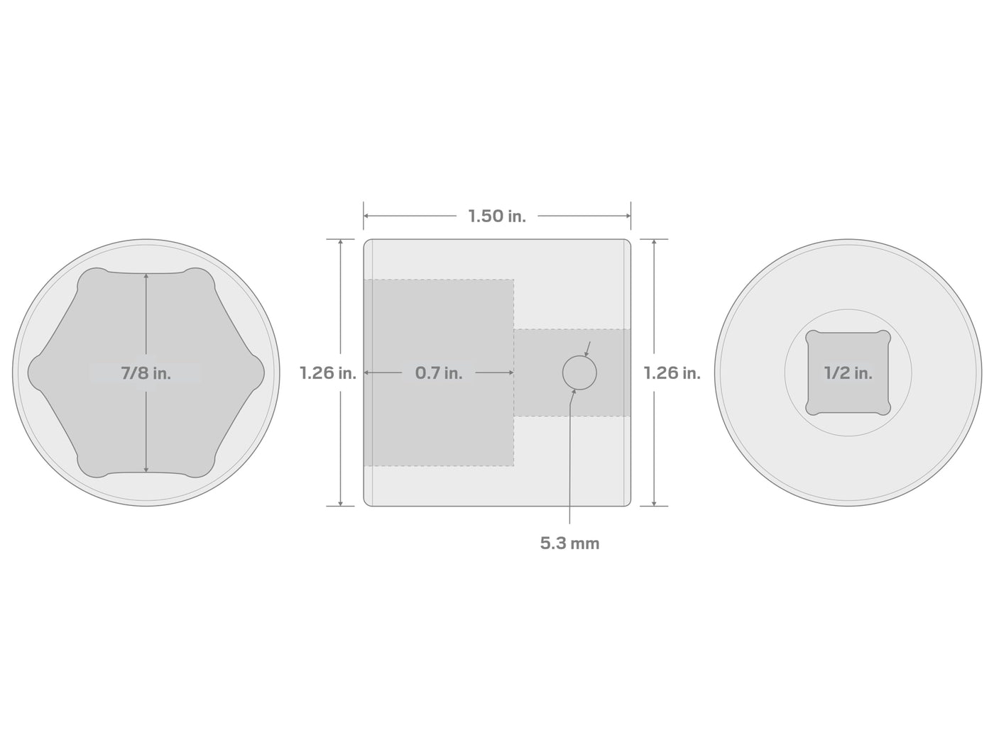 Q: What is the size of the TEKTON 1/2 Inch Drive x 7/8 Inch 6-Point Impact Socket?A: The size of the TEKTON impact socket is 7/8 inch, which is clearly marked with both high-visibility laser markings and permanent stamped markings for easy identification.